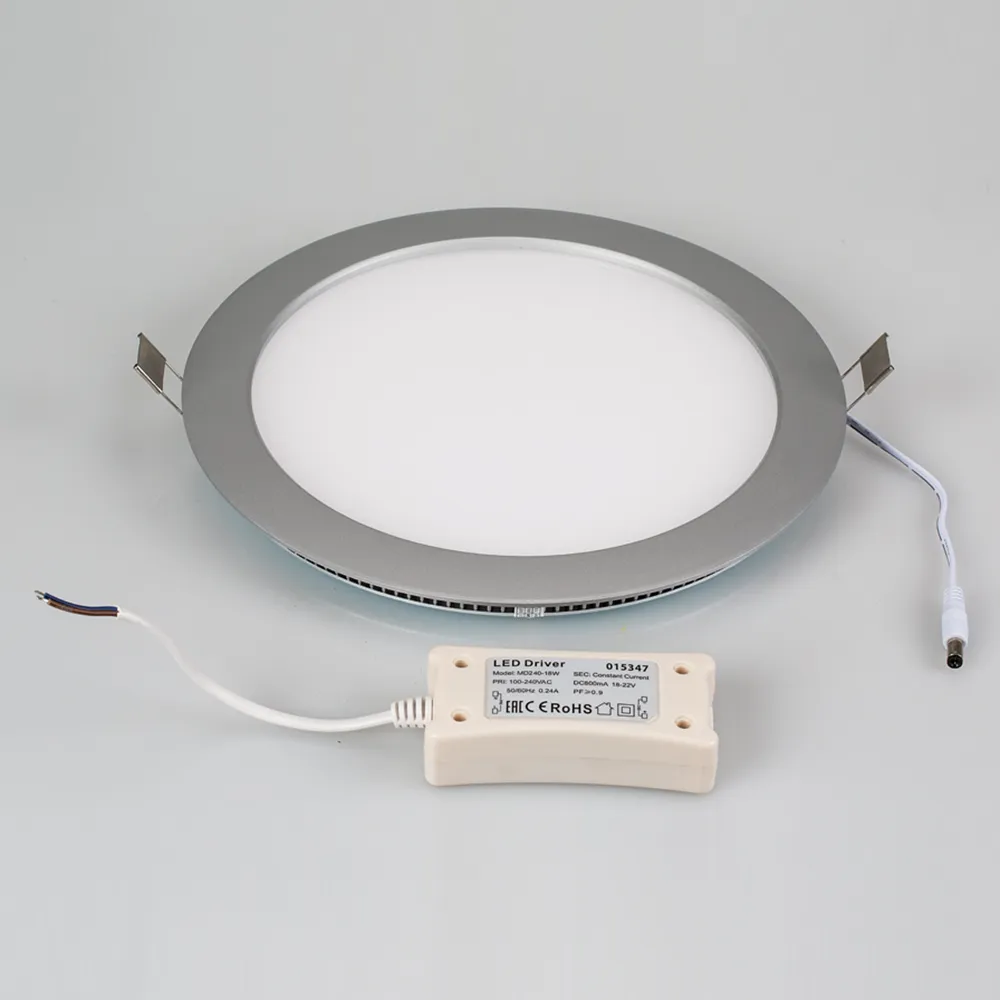 Тонкая круглая панель с эксклюзивным дизайном рамки. Цвет корпуса - серебро. Мощность 18Вт. Цвет свечения БЕЛЫЙ 6000K. Световой поток 1260-1500 лм. Угол 120°. Размер Ф240 x 15мм, установка в отверстие 230мм. Питание от сети 220VAC, драйвер в комплекте (DC870mA, 18-22V).