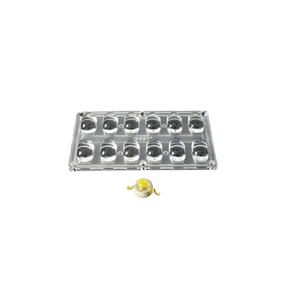 Блочная линза для мощных светодиодов Emitter, угол обзора: вертикальный 130°, горизонтальный 65°, прозрачная линза. Материал PMMA, количество светодиодов на плате: 12. Длина 120 мм, ширина 60 мм, высота 10.2 мм.
