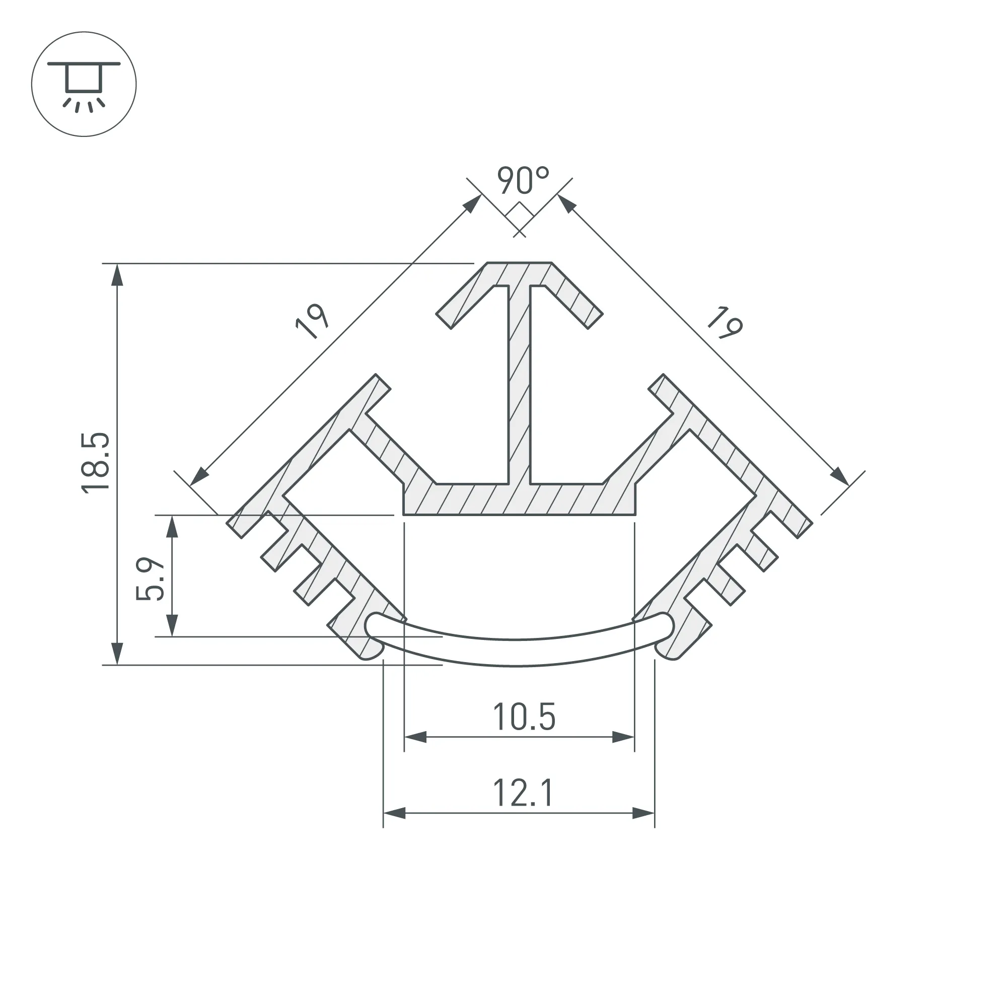 Под заказ от 50 м. Алюминиевый угловой профиль для светодиодных лент и линеек. Габаритные размеры (L×W×H): 2000x19x19 мм. Ширина площадки для ленты 10,5 мм. Экраны, заглушки и другие аксессуары приобретаются отдельно. Цена за 1 метр.