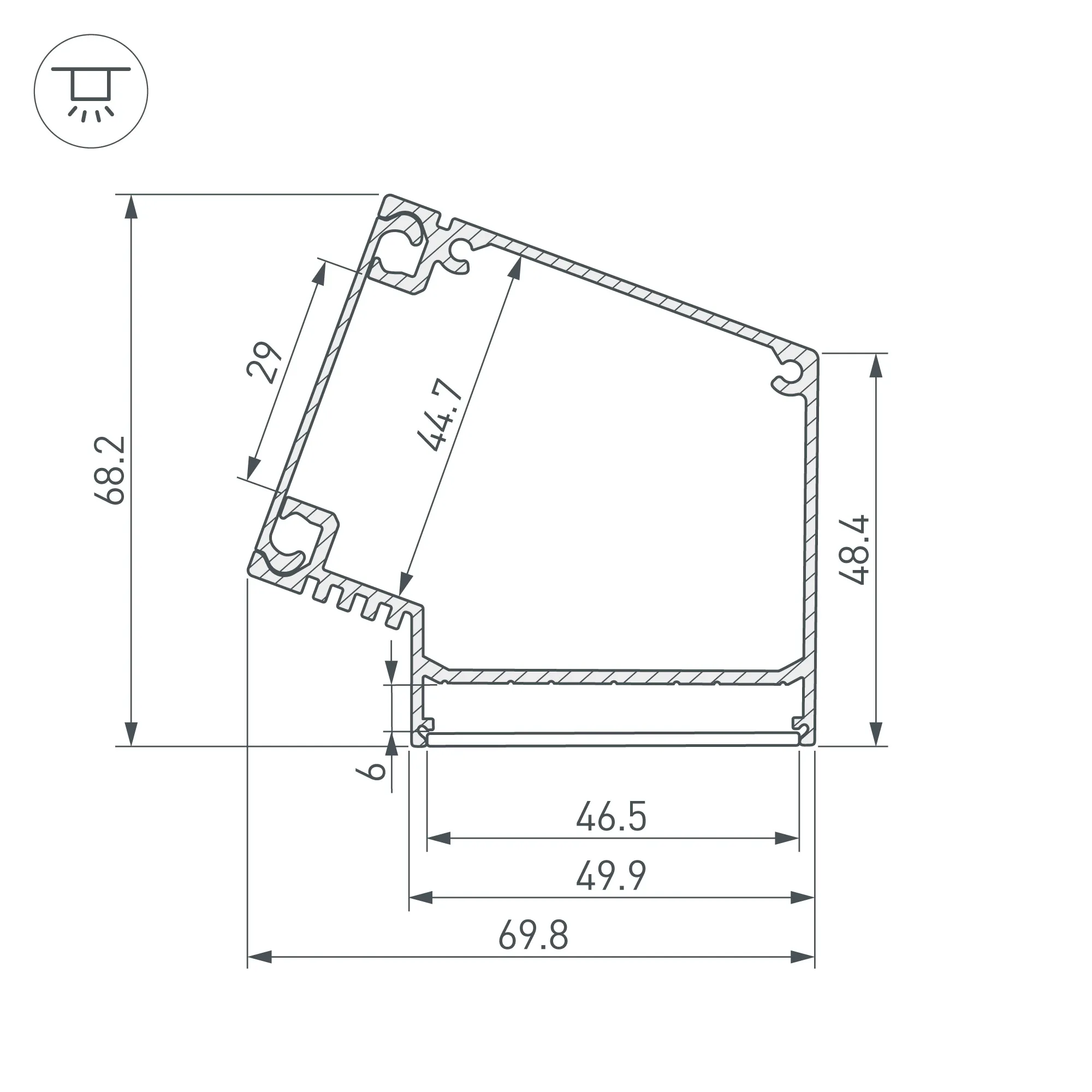 Под заказ от 50 м. Алюминиевый анодированный профиль для светодиодных лент и линеек, с отсеком для блока питания (размер отсека 45х50мм). Освещение под углом 30° к основанию (стене). Габаритные размеры (L×W×H): 2000x73x63 мм. Ширина площадки для ленты 47 мм. Экраны, заглушки и другие аксессуары приобретаются отдельно. Цена за 1 метр.