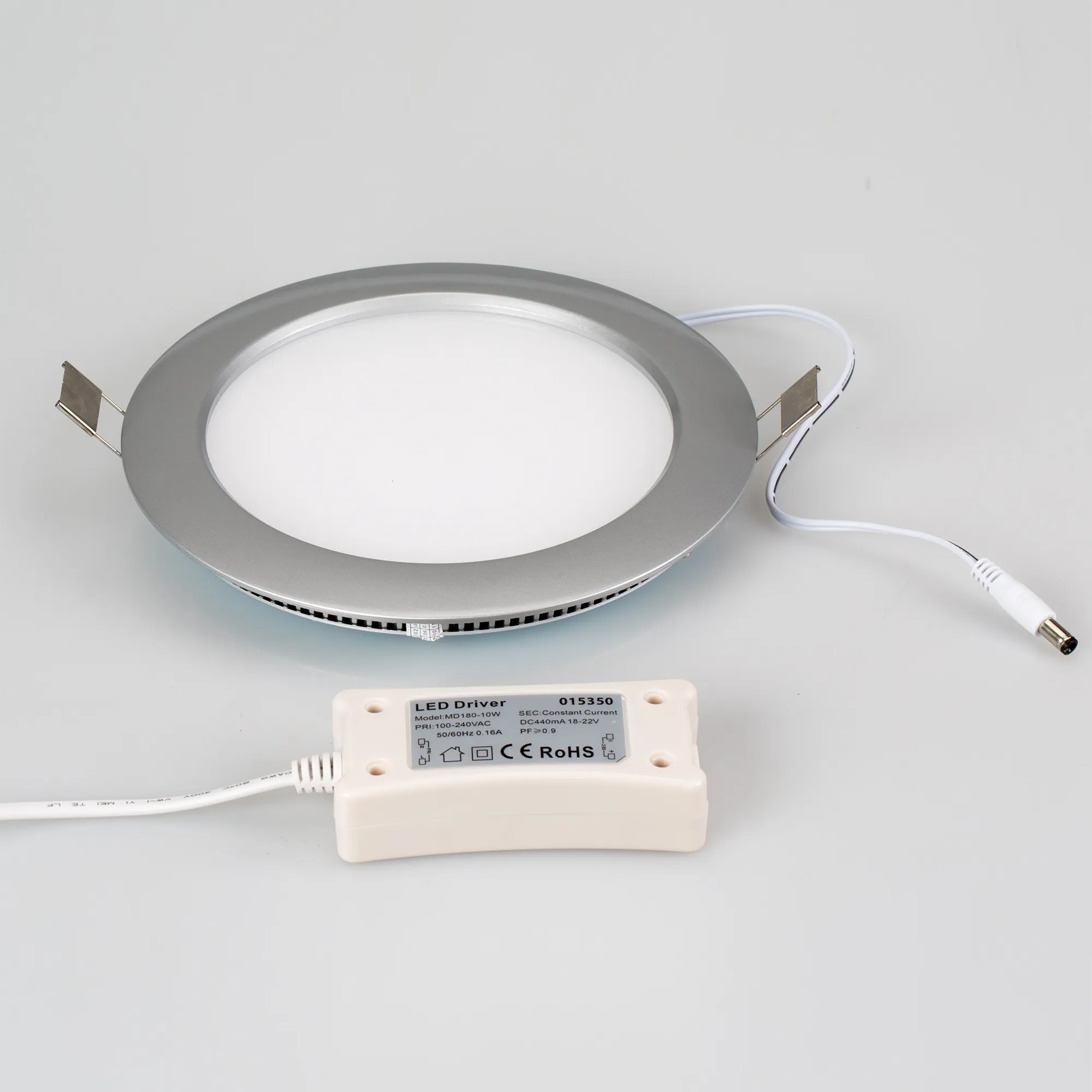 Тонкая круглая панель с эксклюзивным дизайном рамки. Цвет корпуса - серебро. Мощность 10Вт. Цвет свечения ТЕПЛЫЙ БЕЛЫЙ 3000K. Световой поток 670-880 лм. Угол 120°. Размер Ф179 x 16 мм, установка в отверстие 170 мм. Питание от сети 220VAC, драйвер в комплекте (DC490mA, 18-22V).