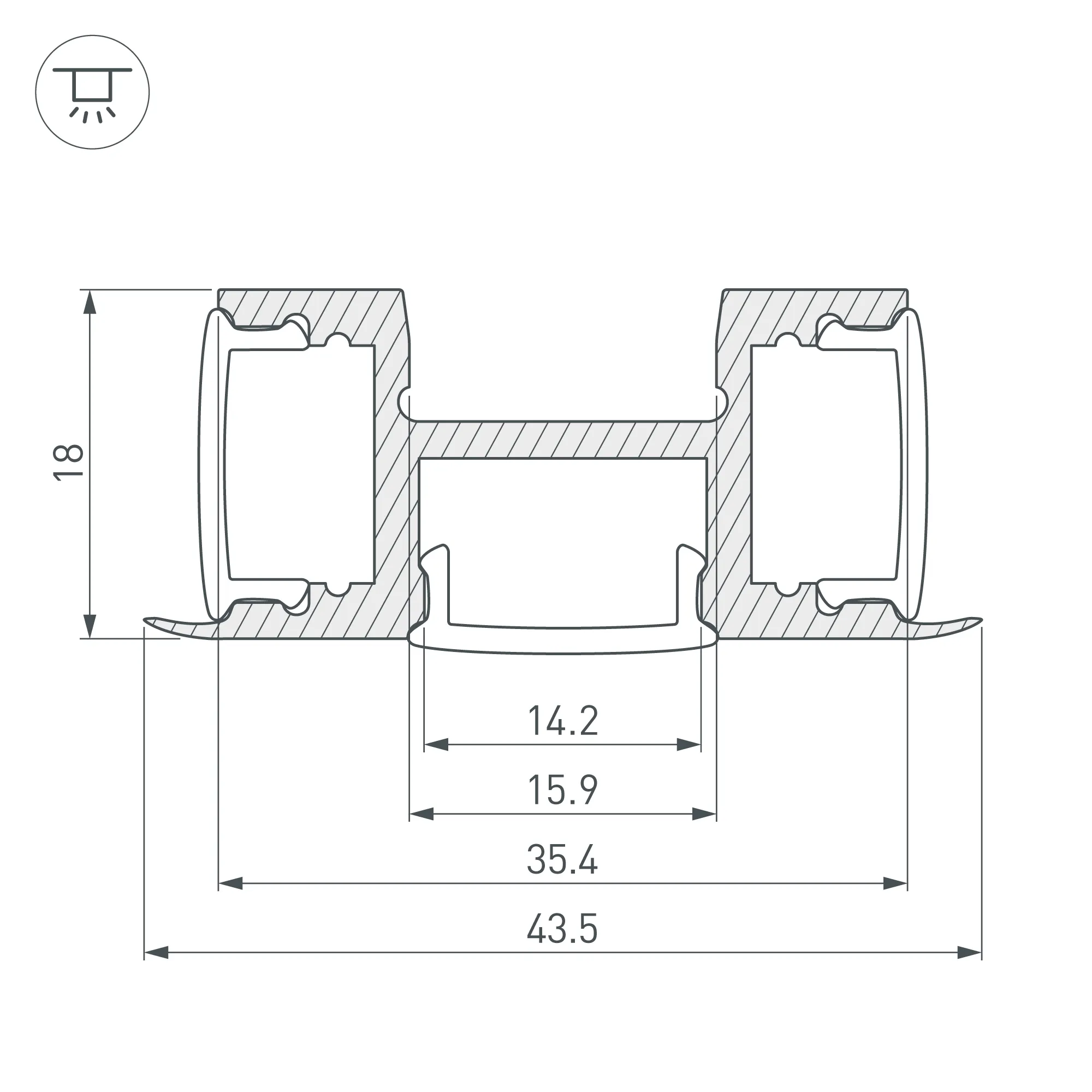 Алюминиевый анодированный накладной профиль с трёхсторонним свечением, для светодиодных лент и линеек. Габаритные размеры (L×W×H): 2000x43,5x18 мм. Ширина основной площадки для ленты 15.2 мм, дополнительных - 12.1 мм. Экраны, заглушки и другие аксессуары приобретаются отдельно. Цена за 1 метр.