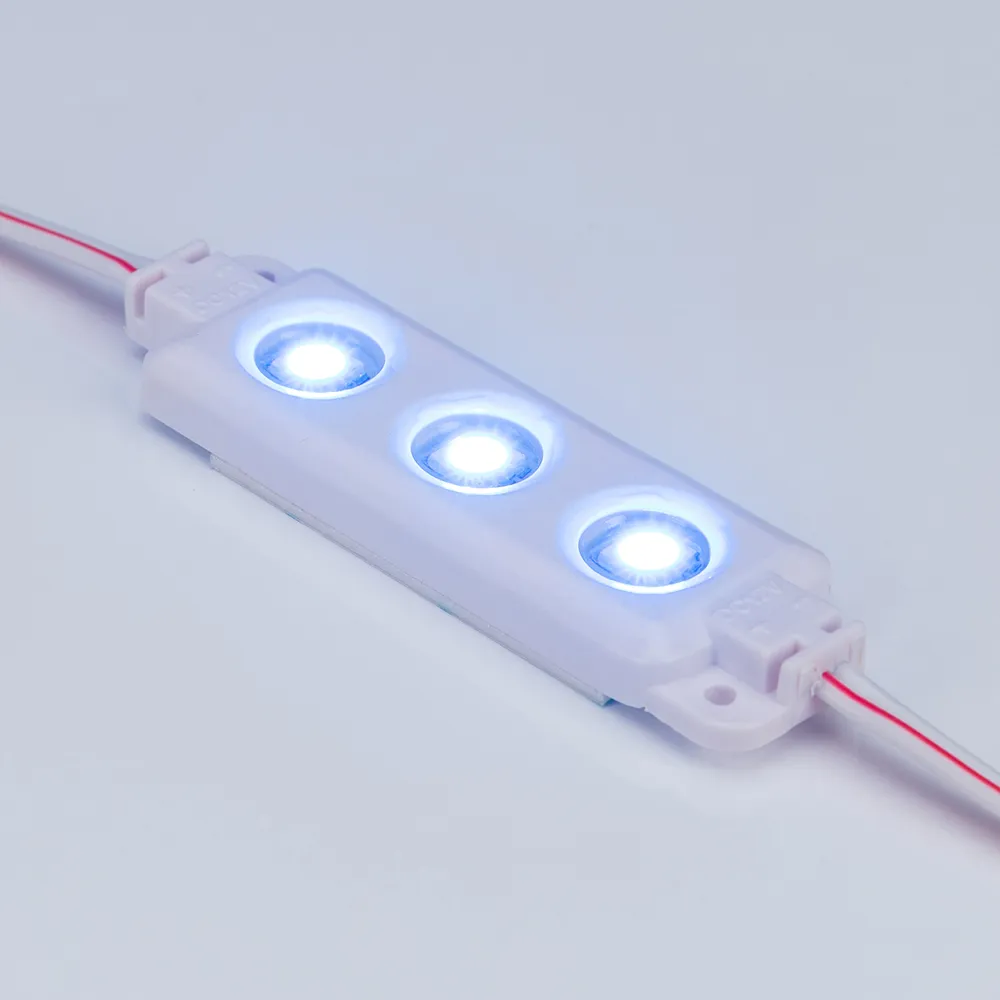 Герметичный светодиодный модуль IP65, СИНИЙ 470 нм, напряжение 12 В, мощность 0.72 Вт, 3 светодиода SMD 5060, св.поток 12 лм, угол 120°. 20 шт на проводе, расстояние между центрами модулей 143.2 мм, длина провода между модулями 75 мм, рекомендуемая глубина установки 50–150 мм. Размер 68,2х19.5х5.7 мм. Гарантия 3 года.