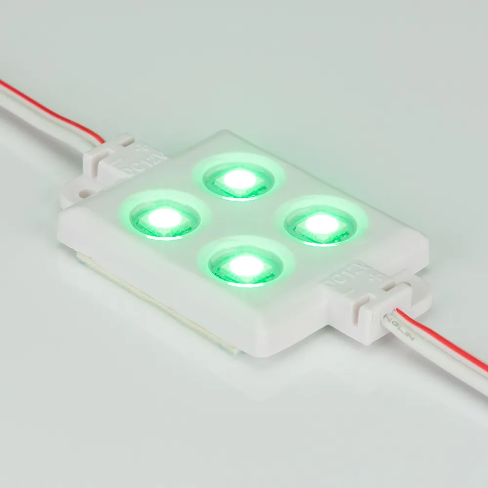 Герметичный светодиодный модуль IP65, ЗЕЛЕНЫЙ 525 нм, напряжение 12 В, мощность 0.96 Вт, 4 светодиода SMD 5060, св.поток 64 лм, угол 120°. 20 шт на проводе, расстояние между центрами модулей 194.8 мм, длина провода между модулями 140 мм, рекомендуемая глубина установки 80–180 мм. Размер 54.8х33.2х5.9 мм. Гарантия 3 года.