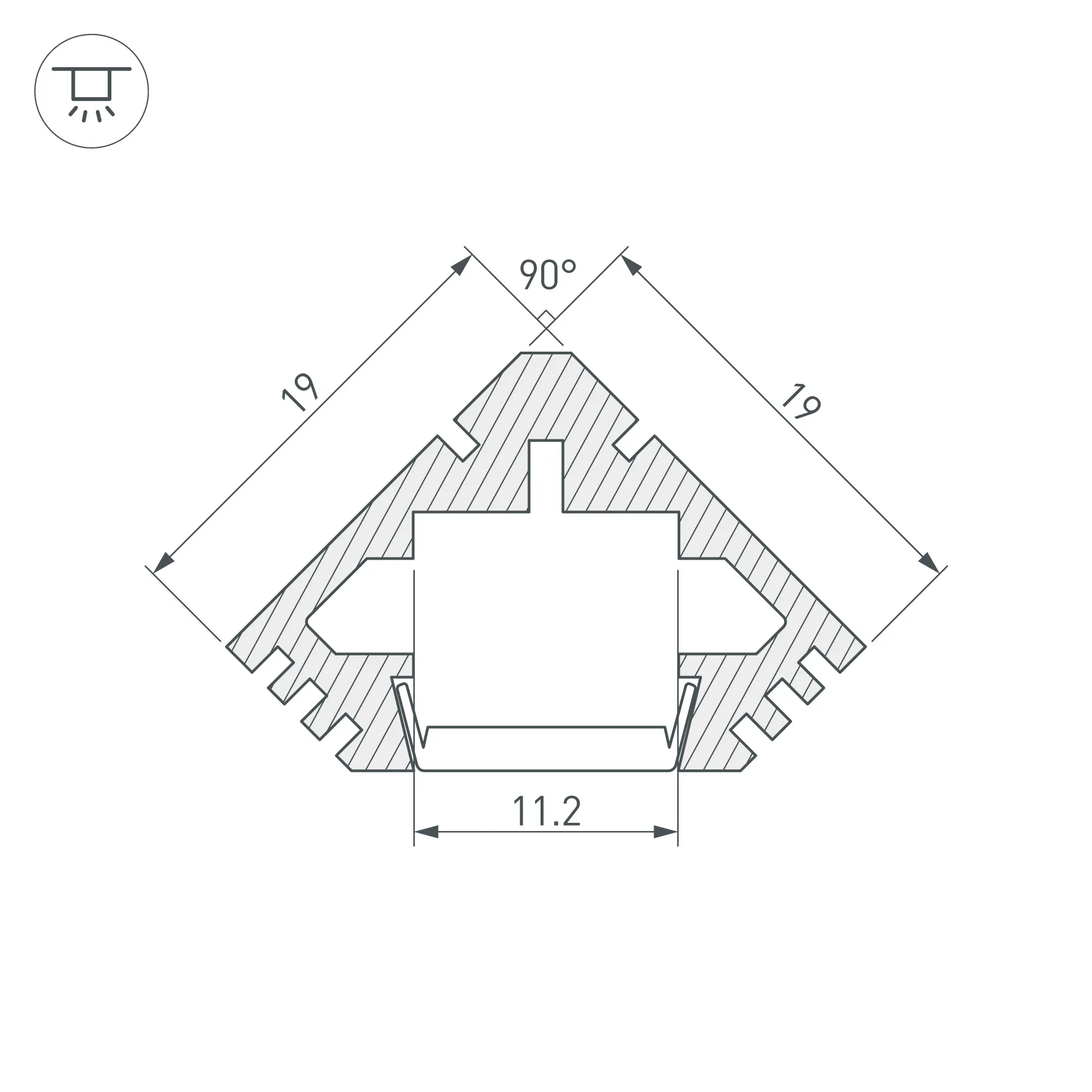 Алюминиевый угловой профиль для светодиодных лент и линеек. Цвет - чёрный RAL9005 (порошковая окраска). Габаритные размеры (L×W×H): 2000x19x19 мм. Ширина площадки для ленты 11,2 мм. Экраны, заглушки и другие аксессуары приобретаются отдельно. Цена за 1 метр.