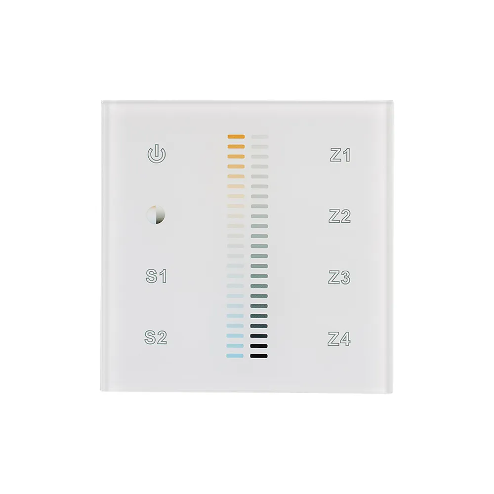 Встраиваемая стеклянная белая Touch-панель с сенсорным слайдером, 4 зоны. Управление цветовой температурой и яркостью в 4 зонах, 2 сцены в каждой зоне. Управление – по радиоканалу (совместимы с контроллерами SR-1009x). Питание 220 В. Размер 86x86x29 мм. Аналогичные по дизайну панели в серии SMART (устройства не совместимы).
