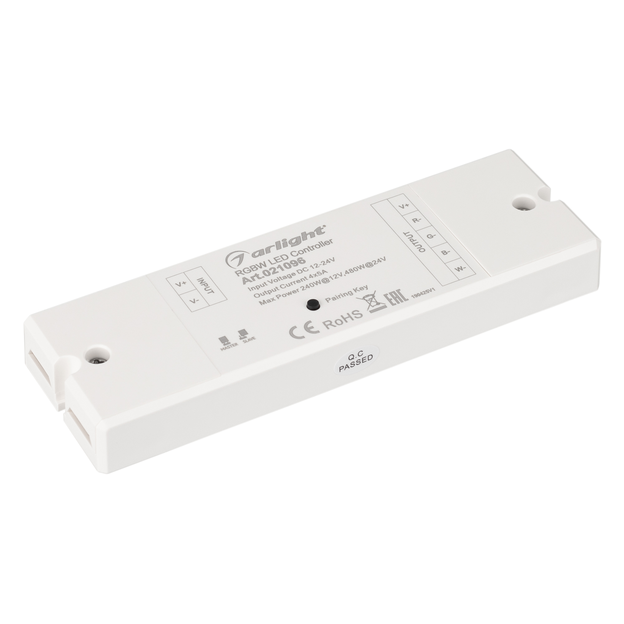 Однозонный RGBW-контроллер, комплект из пульта RF (868MHz) с сенсорным кольцом выбора цвета и 4-канального контроллера (12-24 В, 4х5А, 240-480 Вт). Белый корпуc. Размеры пульта 120x48x17 мм, контроллера 145х46х16 мм.