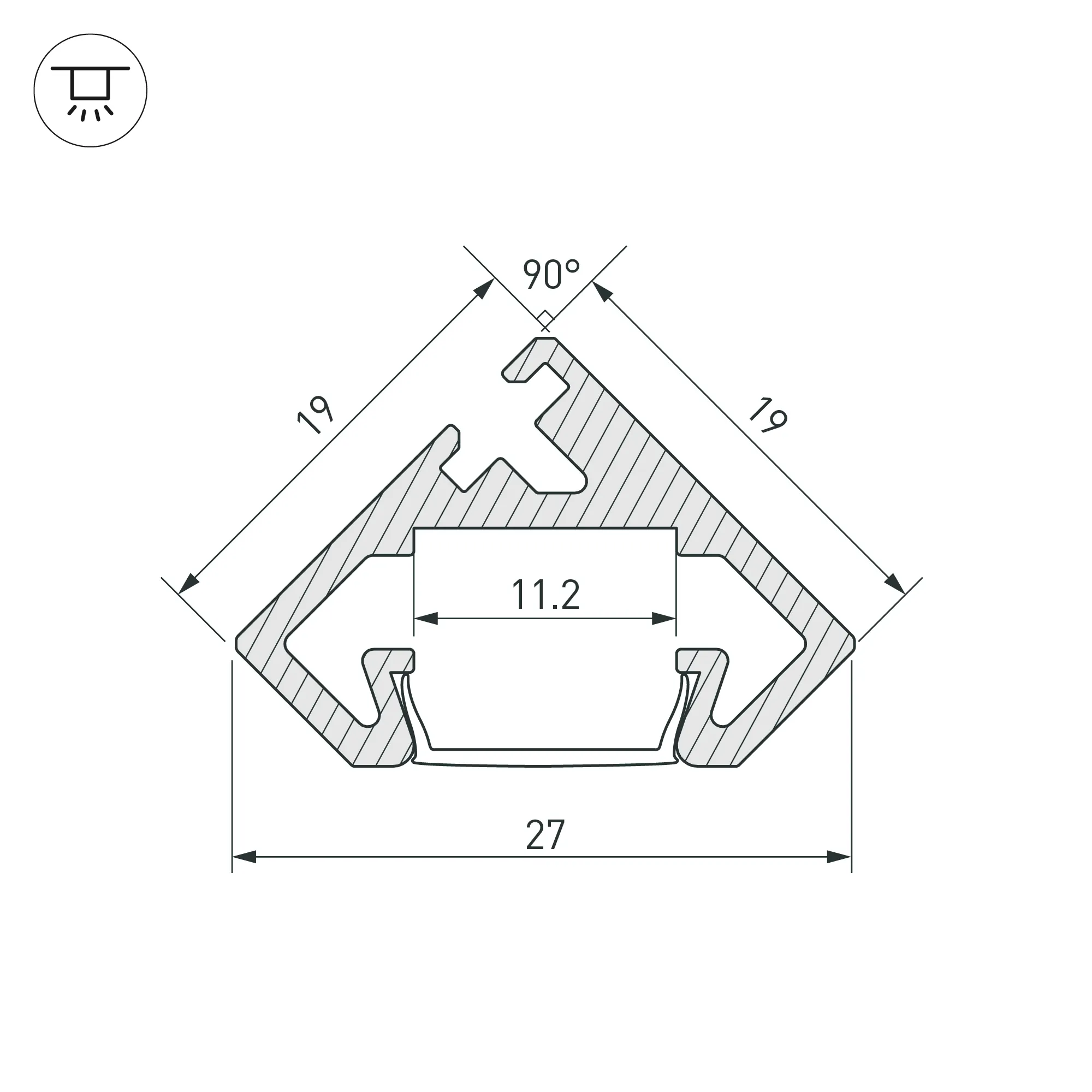 Алюминиевый анодированный угловой профиль для светодиодных лент и линеек. Модификация углового профиля PDS45 для светодиодной ленты. Добавлен паз для пружинных держателей и соединителей. Используется для подсветки ниш, мебели, наружных контуров зданий при герметизации до IP67. Габаритные размеры (L×W×H): 2000x19x19 мм. Ширина площадки для ленты 11,2 мм. Экраны, заглушки и другие аксессуары приобретаются отдельно. Цена за 1 метр.