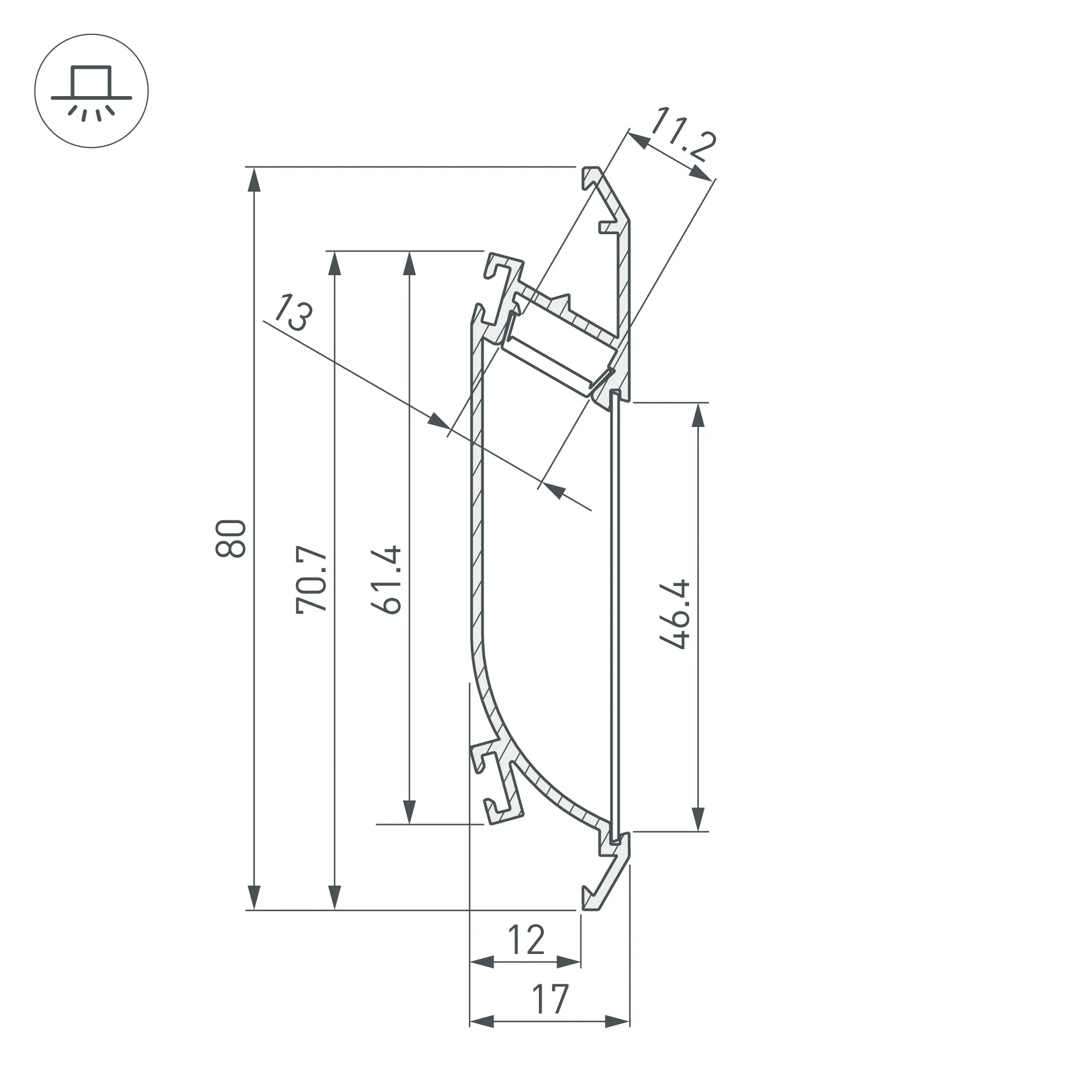 Алюминиевый анодированный профиль для подсветки стен. Подходит для гипсокартона толщиной 12мм. Габаритные размеры (L×W×H): 2000x17x80 мм. Ширина площадки для ленты 11,2 мм. Экраны, заглушки и другие аксессуары приобретаются отдельно. Цена за 1 метр.