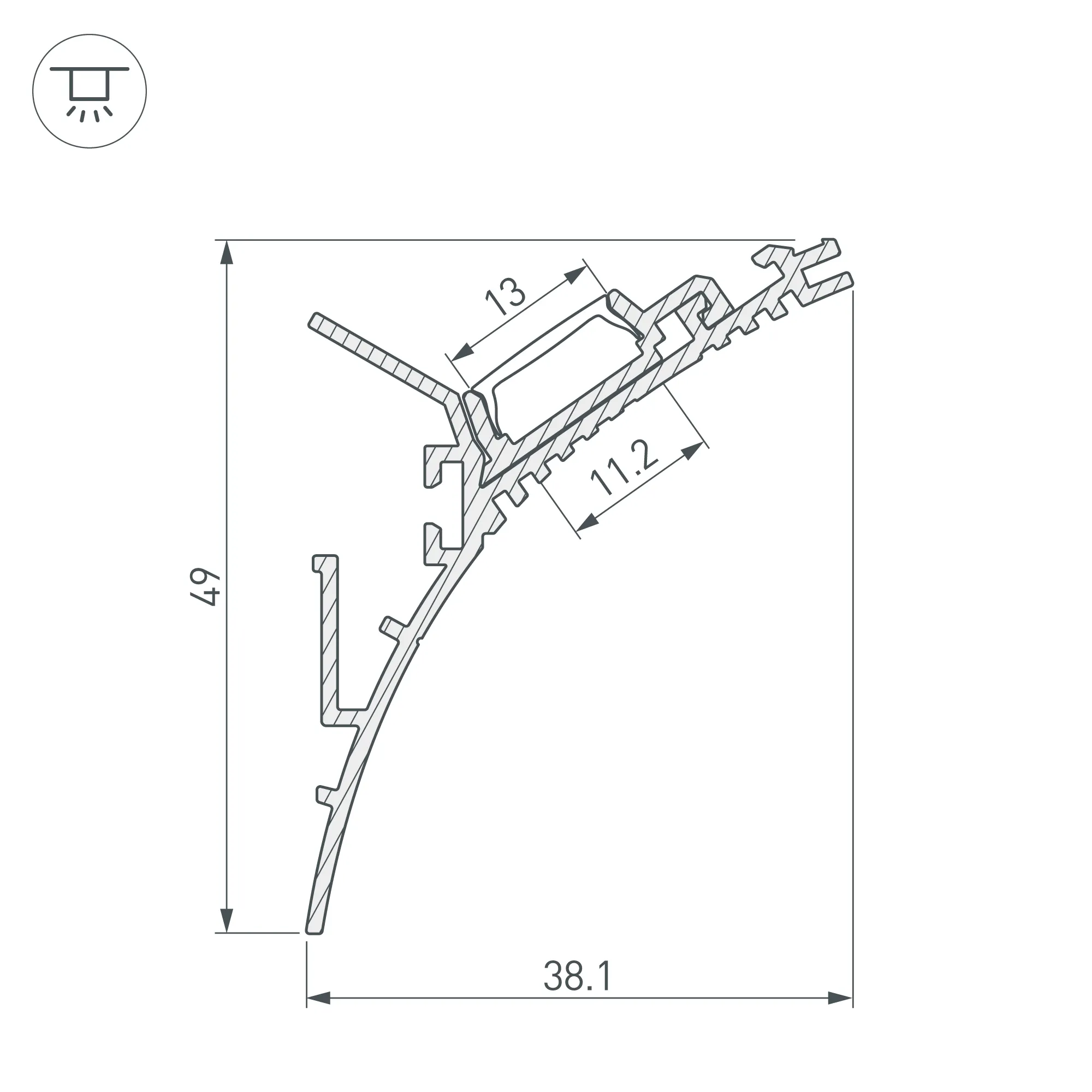 Под заказ от 20 м. Алюминиевый профиль для подсветки стен и потолков. Штукатурка наносится сверху, делая профиль невидимым. Состоит из двух частей - основания и профиля для светодиодной ленты. Габаритные размеры (L×W×H): 2000x38,1x19 мм. Ширина площадки для ленты 11,2 мм. Экраны, заглушки и другие аксессуары приобретаются отдельно. Цена за 1 метр.