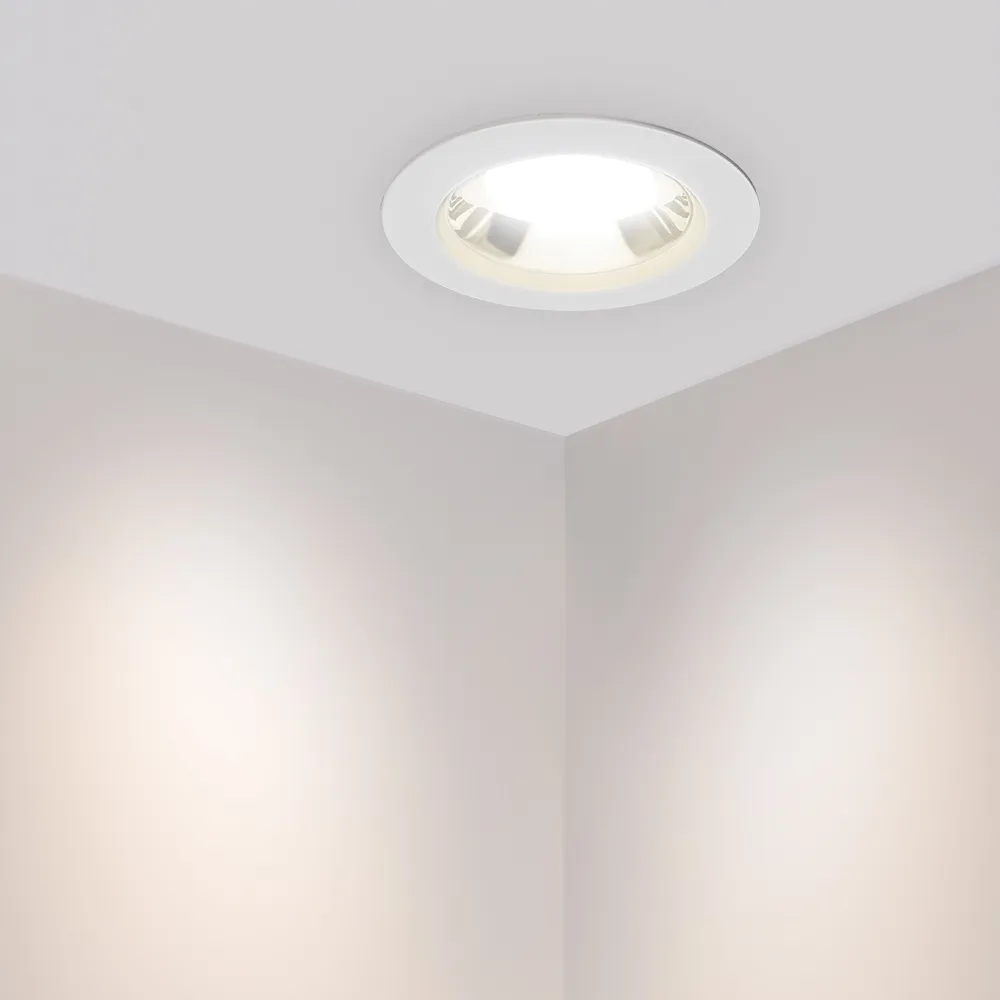 Даунлайт, угол 90° / 12Вт/ БЕЛЫЙ 6000K / LED 2835 24шт / 1035 лм / CRI>80. Белый корпус, алюминий, опрессованный в термопласт. Питание AC 100-240V (драйвер в к-те 140-150mA 40-85V). Габариты: (d)130х(h)60 мм, врезное отверстие 118 мм.