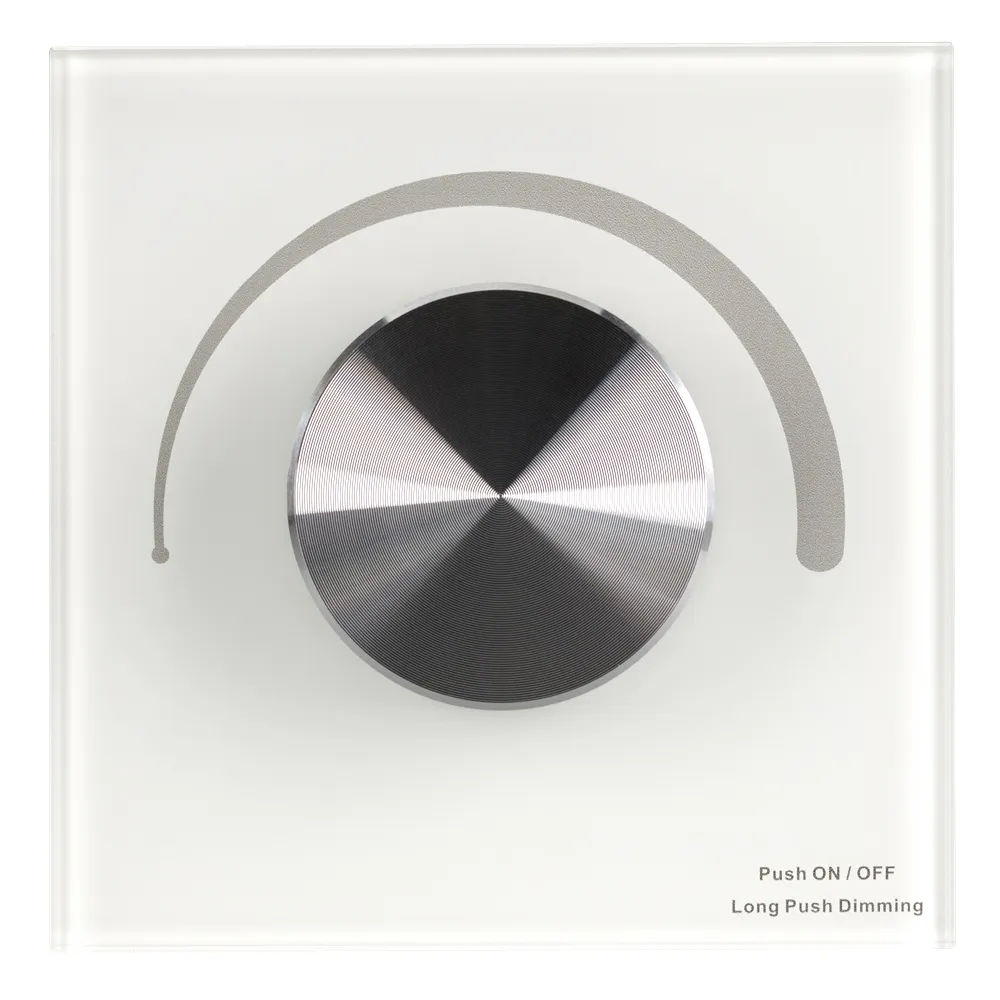 Встраиваемая роторная стеклянная панель 2.4 ГГц, цвет белый. Для управления одноцветными источниками света (ШИМ). Управление яркостью с помощью роторного регулятора. Работает в режиме master/slave и может выполнять функцию независимого контроллера. Питание/рабочее напряжение 12-24VDC, 4 параллельных канала по 3А максимальной нагрузки на канал, максимальная суммарная мощность 144-288W. Габариты 86х86х50 мм. Панель совместима с диммерами серии SMART. Возможно управление пультами (см. совместимые товары) или другими панелями.