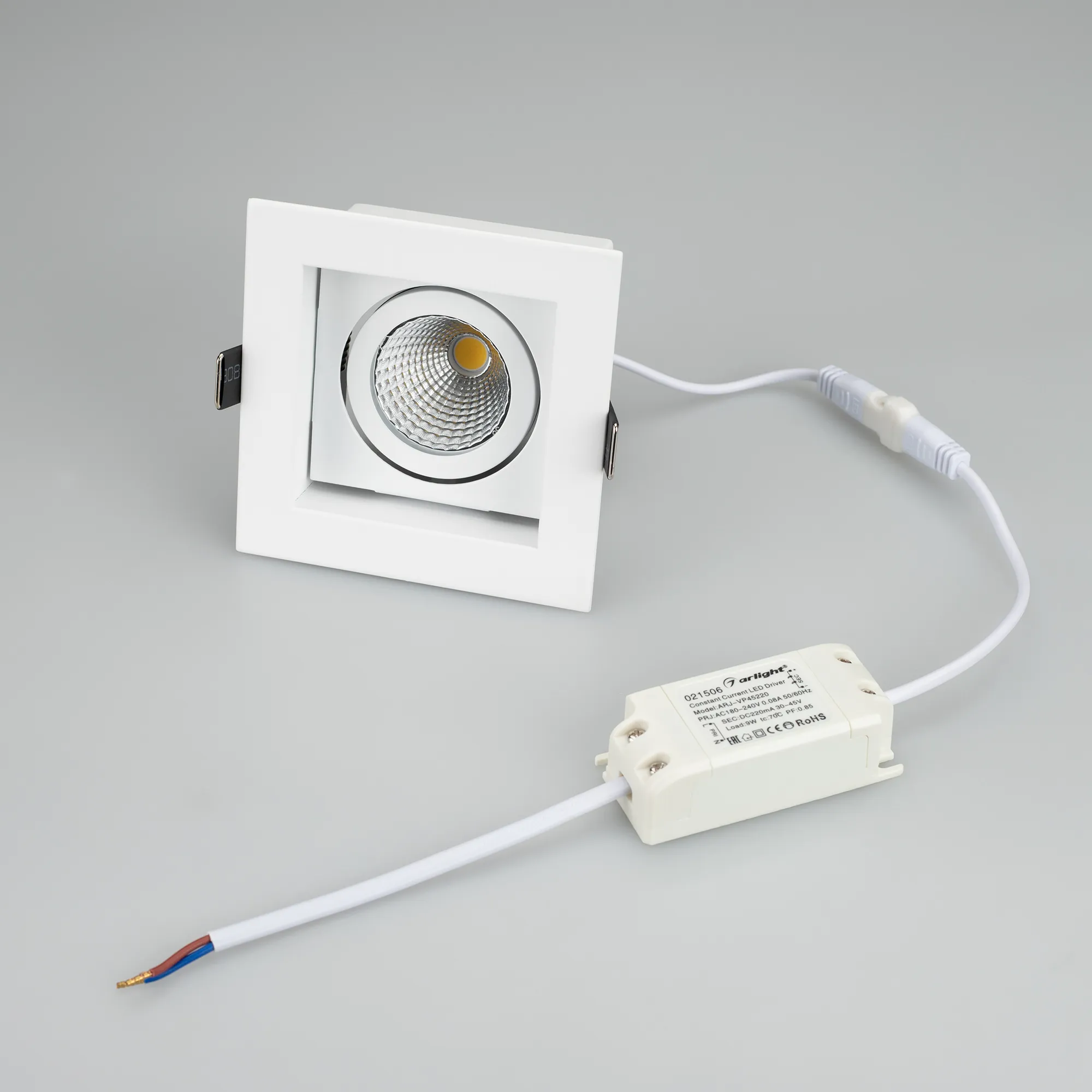 Поставка под заказ от 500 шт. Встраиваемый карданный светильник. Угол 38° / 9Вт / БЕЛЫЙ 6000K / 680лм, CRI>80. Корпус из белого алюминия. Питание AC180-240V, 9Вт, в комплекте драйвер 200mA 30-45V. Размеры LxWxH: 102х102x85мм, отверстие для установки 85x85мм.