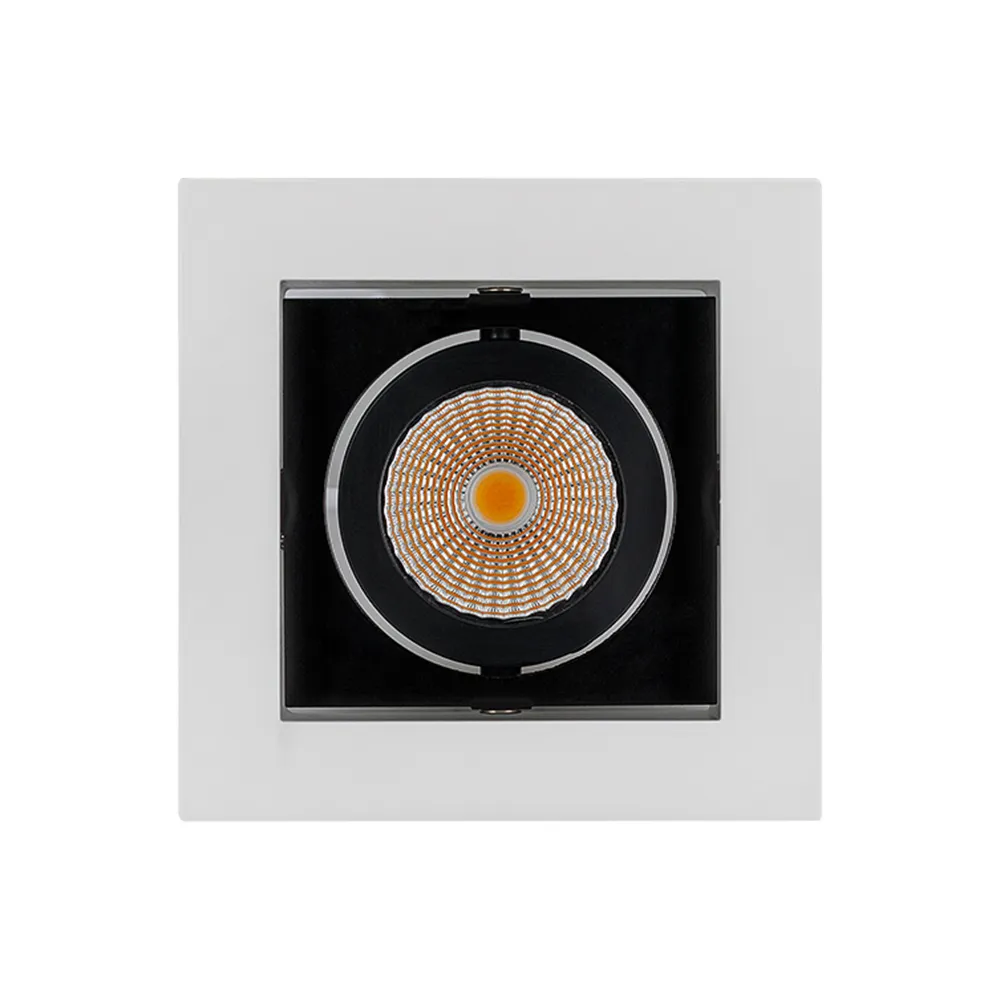 Встраиваемый карданный светильник. Угол 38° / 9Вт / ДНЕВНОЙ БЕЛЫЙ 4000K / 680лм, CRI>80. Корпус из белого алюминия с черными вставками. Питание AC180-240V, 9Вт, в комплекте драйвер 200mA 30-45V. Размеры LxWxH: 102х102x85мм, отверстие для установки 85x85мм.