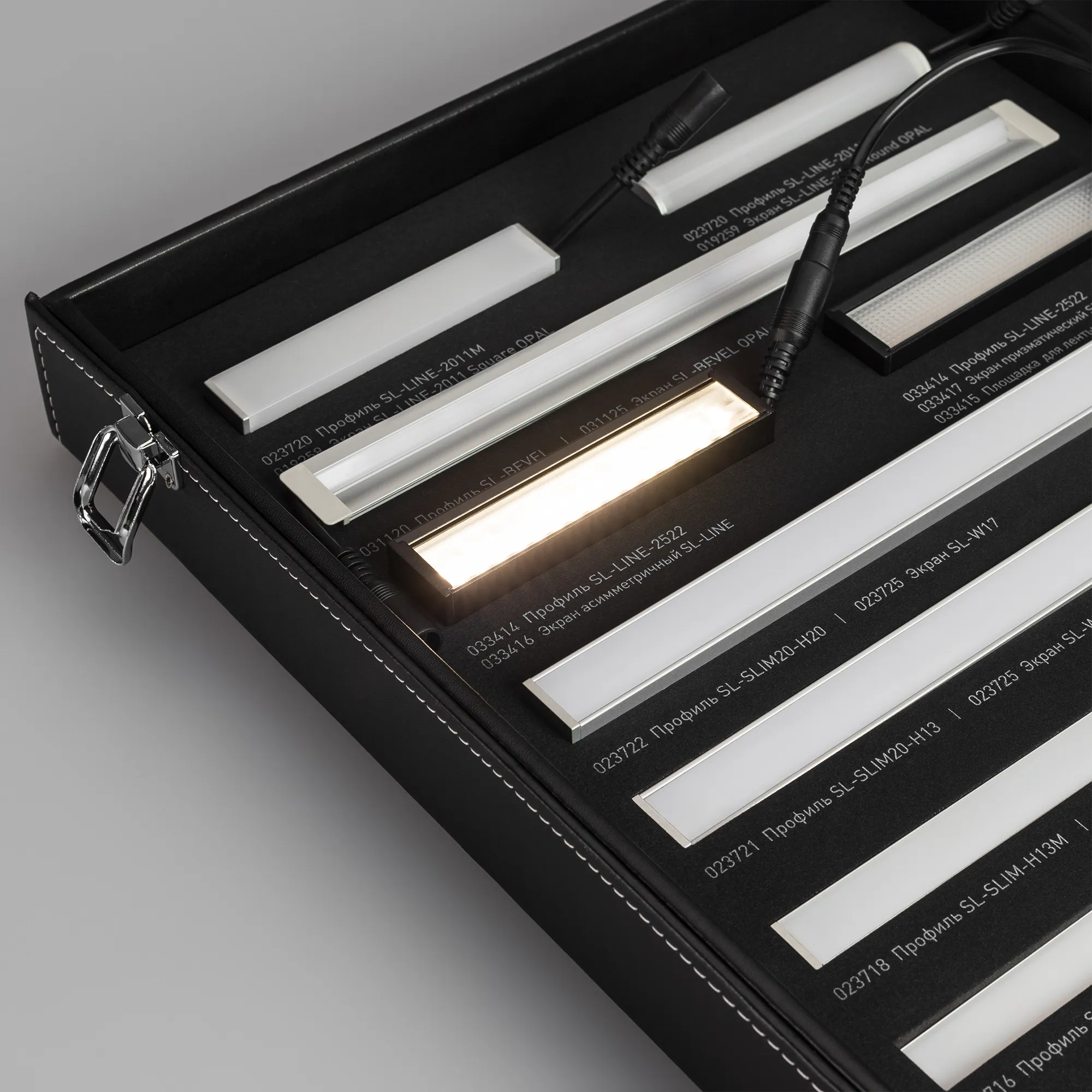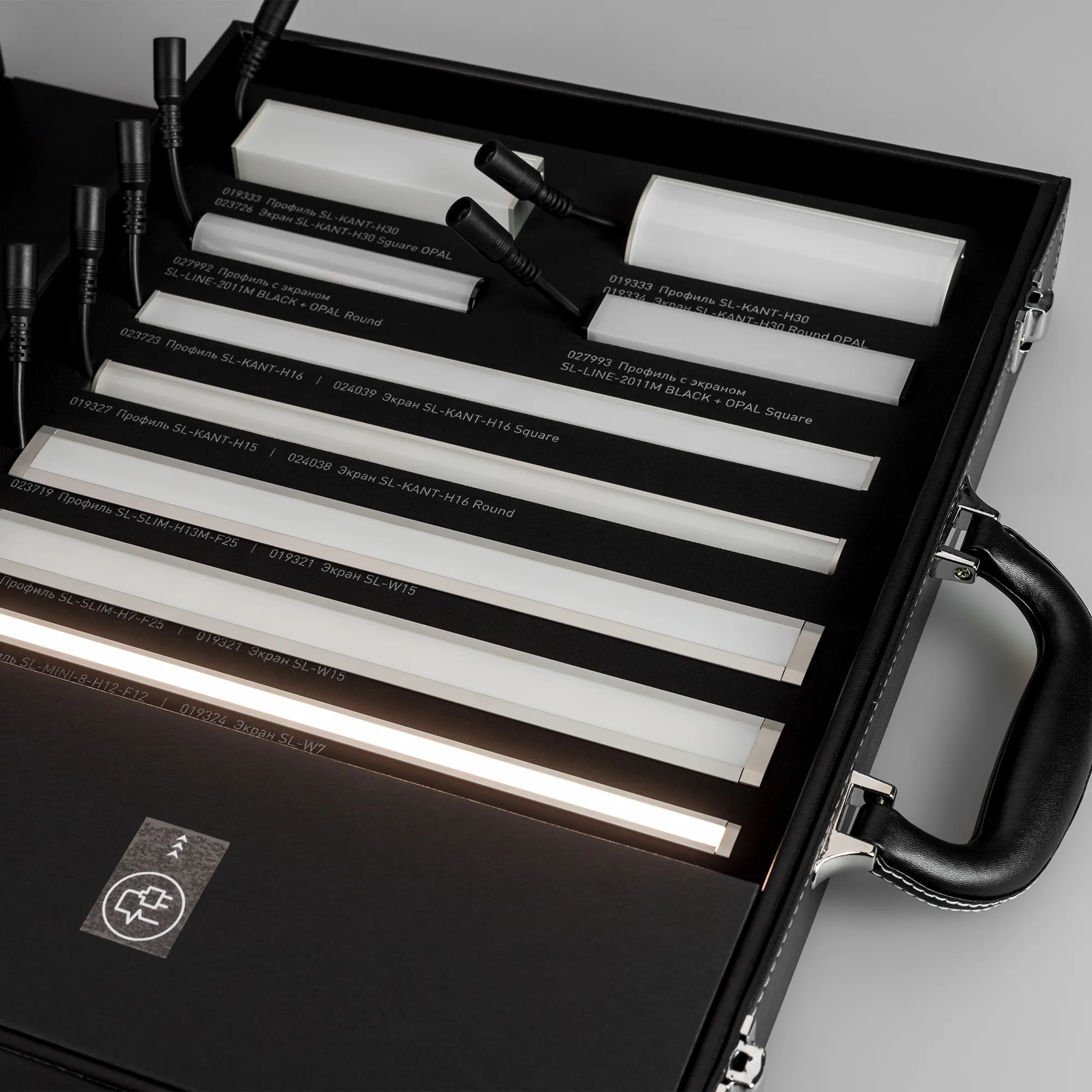 Демонстрационный набор обновлённых профилей серий SL-LINE-2011, SL-KANT-H16/H30, SL-SLIM/SLIM20, SL-MINI-8. Включает отрезки профиля с экраном и заглушками по 20см со светодиодной лентой 24В. Также в комплекте блок питания.