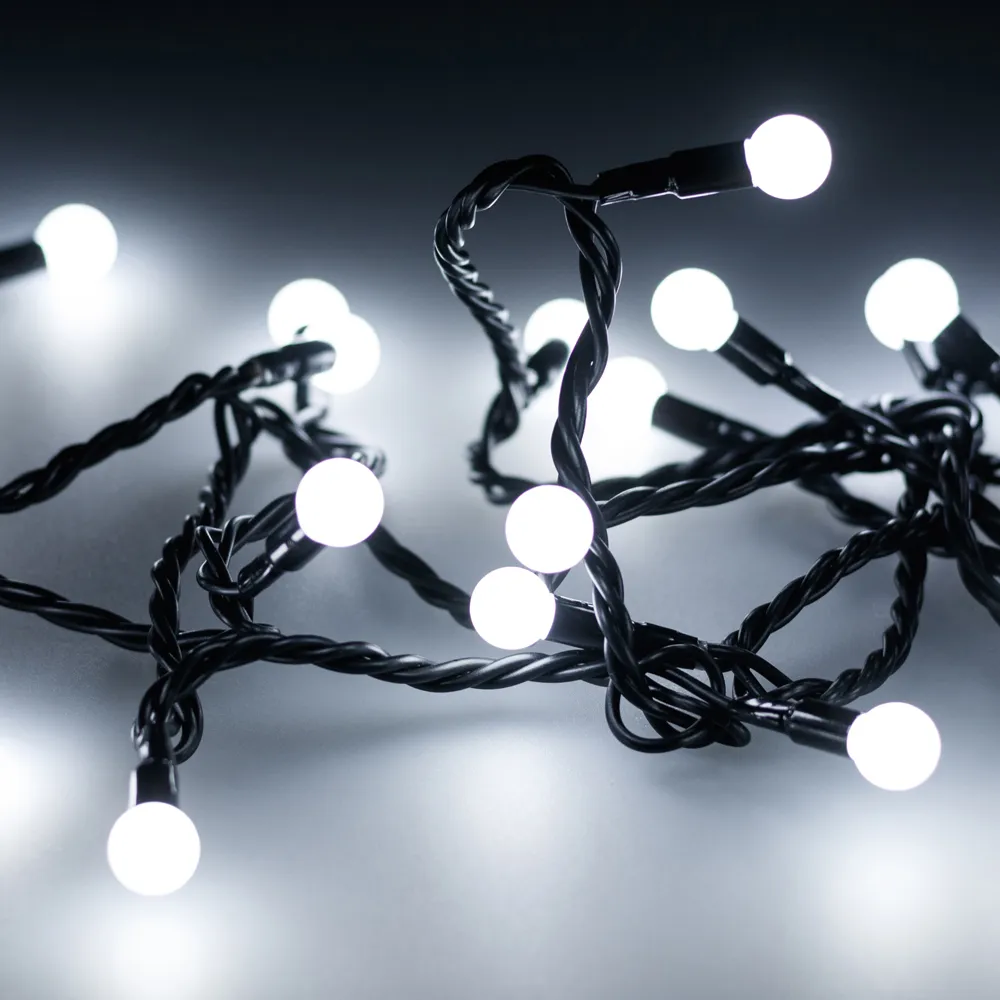 Светодиодные шарики Classic. Размер 5000 мм. Цвет свечения БЕЛЫЙ (6000 К), постоянное свечение. 50 шариков со светодиодом внутри размером 13 мм с мягким световым рисунком (выпуклая молочно-белая линза). Провод чёрный, ПВХ. Питание 230 В, Мощность 3.5 Вт, защита IP65, применение в помещении и на улице под навесом. Аксессуары для подключения в комплекте.