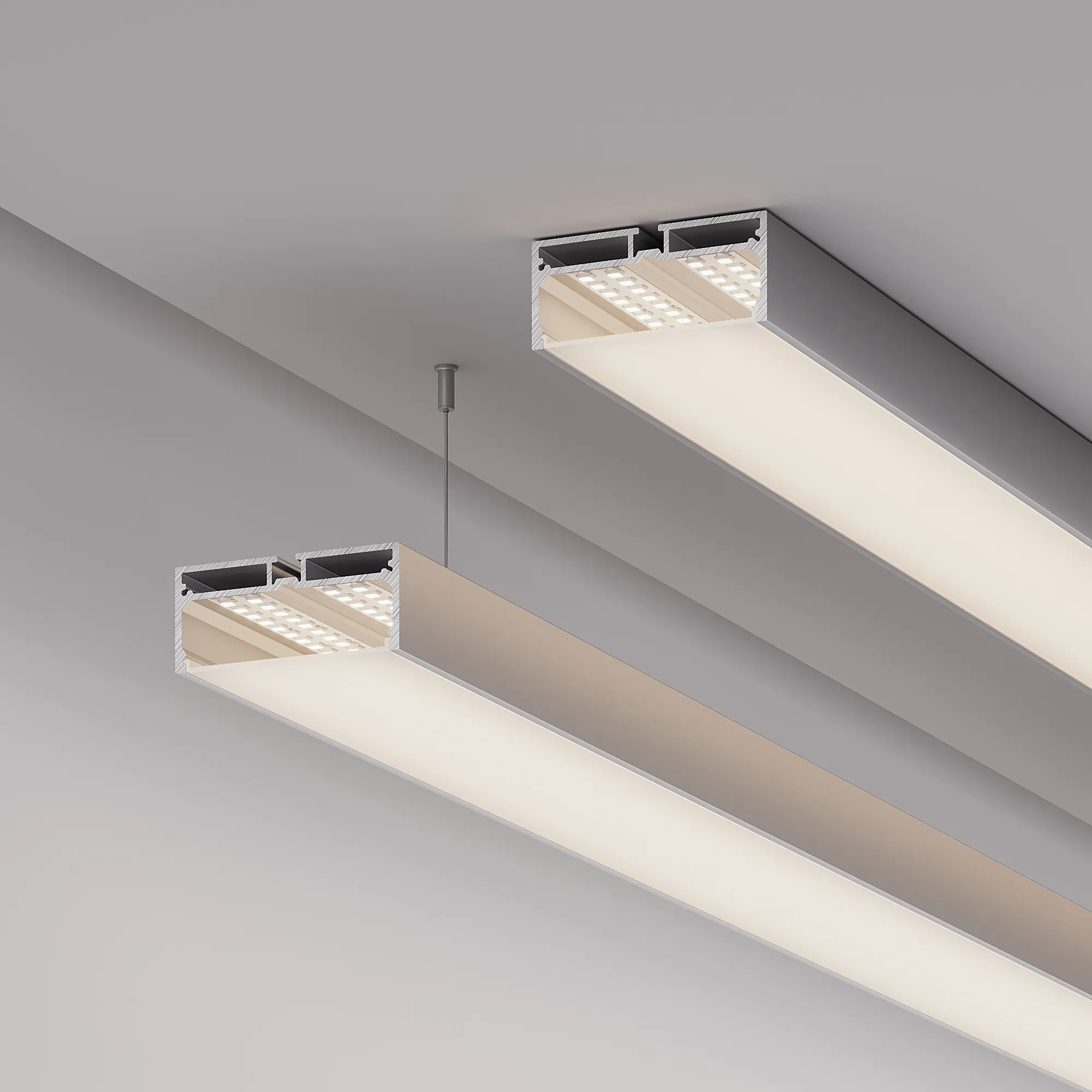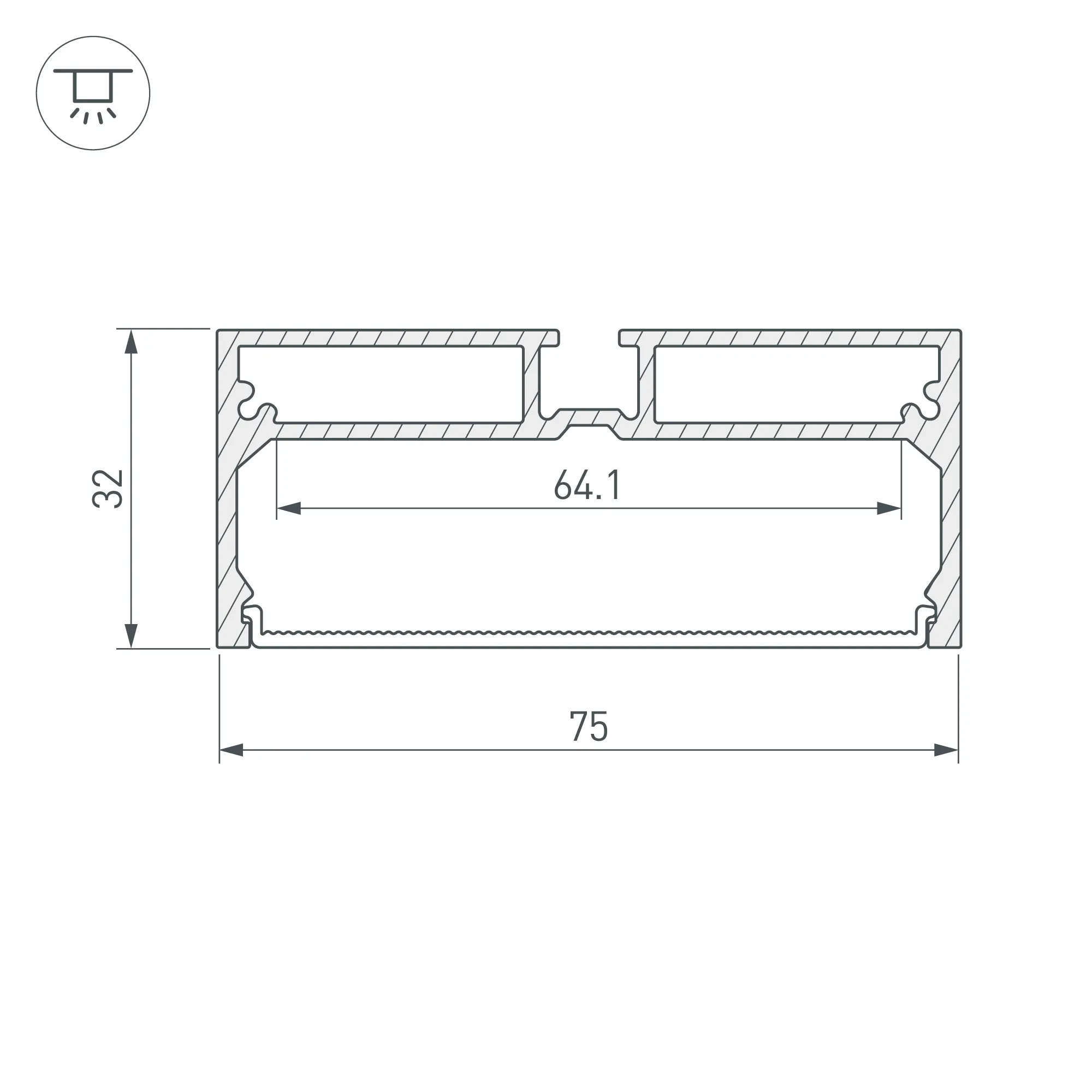Комплект с экраном. Алюминиевый анодированный профиль для светодиодных лент и линеек. Габаритные размеры (L×W×H): 2000x75x32 мм. Ширина площадки для ленты 64 мм. Экран с УФ-защитой. Аксессуары приобретаются отдельно.