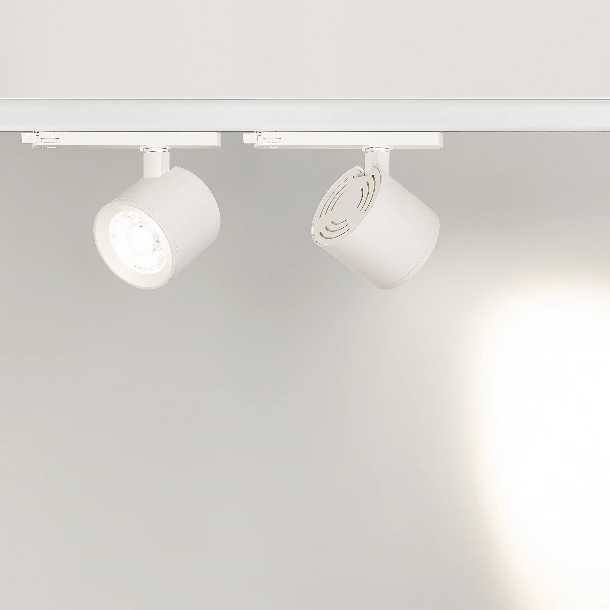 Светильник подвесной для треков/шин 4 провода, 20Вт. Цвет свечения БЕЛЫЙ ТЕПЛЫЙ 3000K, световой поток 1990лм, угол 24°, CRI>90. Корпус круглый, металл, цвет белый, IP20. Размеры DxH Ø100x80мм. Входное напряжение AC220-240V, мощность 20Вт. Драйвер встроенный в адаптер (30-40V, 450mA).