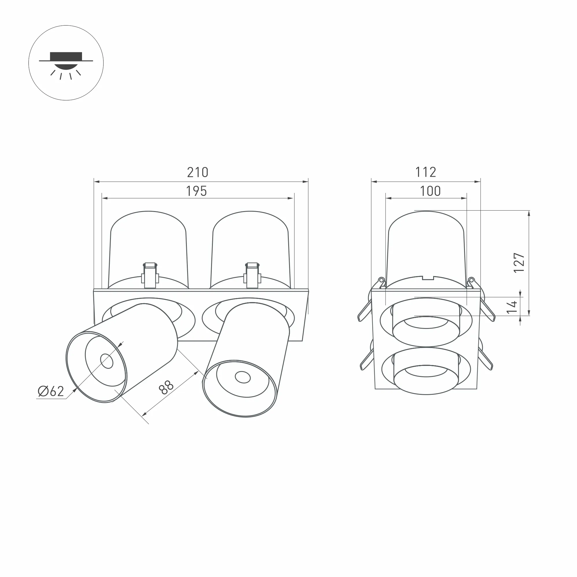 Встраиваемый поворотный выдвигающийся светильник для потолка. Светодиоды 2x10W, цвет БЕЛЫЙ ДНЕВНОЙ 4000K, св.поток 1900лм, угол 24°, RA>90. Корпус белый. Мощность 20Вт, питание AC220-240V. Размеры WxLxH 112x210x127мм. Установка в отверстие 100x195мм. Драйвера в комплекте (2 шт 30-48V 250mA).