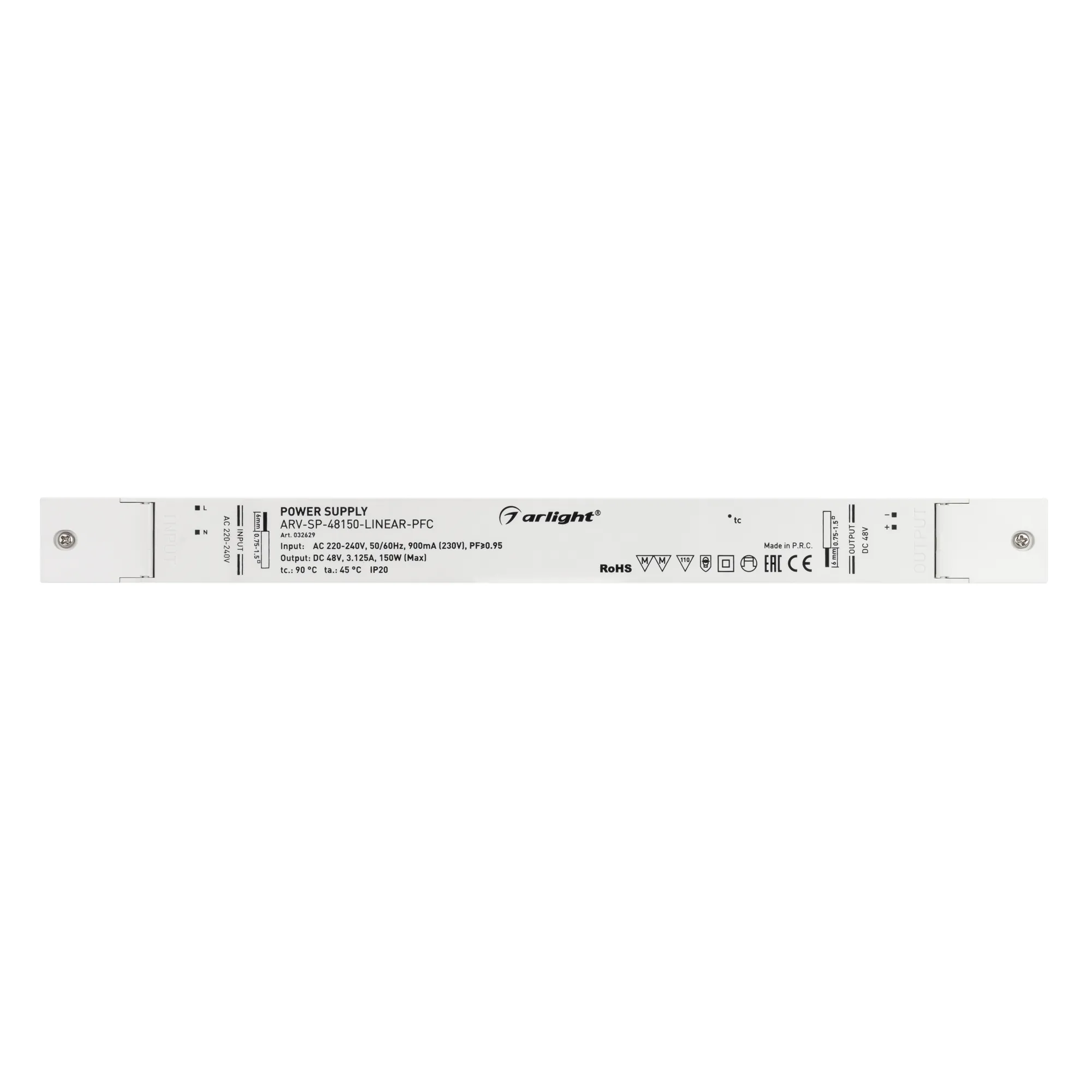 Источник напряжения с гальванической развязкой для светодиодных изделий. Входное напряжение 220-240 VAC. Выходные параметры: 48 В, 3.125 А, 150 Вт. Встроенный PFC >0,95. Негерметичный пластиковый корпус IP 20. Габаритные размеры длина 350 мм, ширина 30 мм, высота 18 мм. Гарантийный срок 5 лет.