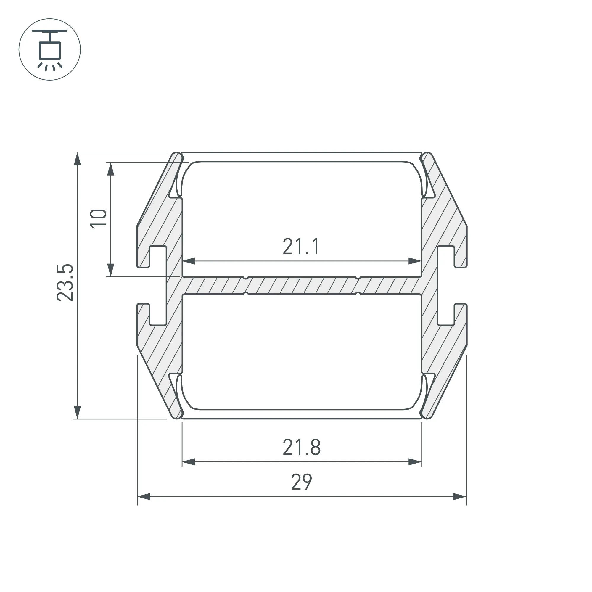 Под заказ от 40 м. Алюминиевый анодированный подвесной профиль с двусторонним свечением (в стороны). Габаритные размеры (L×W×H): 2000x29x23,5 мм. Ширина площадки для ленты 21,1 мм. Для двух лент шириной до 20 мм. Экраны, заглушки и другие аксессуары приобретаются отдельно. Цена за 1 метр.