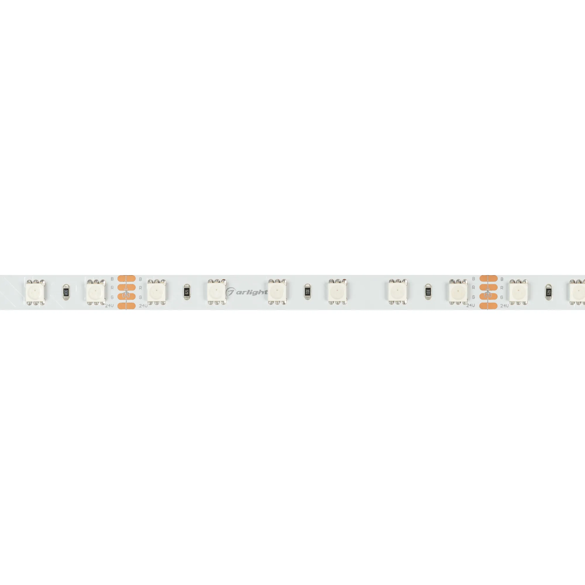 Мультицветная светодиодная лента RT серии B60. Светодиоды SMD 5060, 60 шт/м, белая плата шириной 10 мм, скотч 3M. Цвет RGB, угол 120°. Питание 24 В, мощность 14.4 Вт/м (72 Вт на 5 м). Размеры 5000x10x2.2 мм. Мин. отрезок 100 мм, 6 светодиодов. Цена за 1 м.