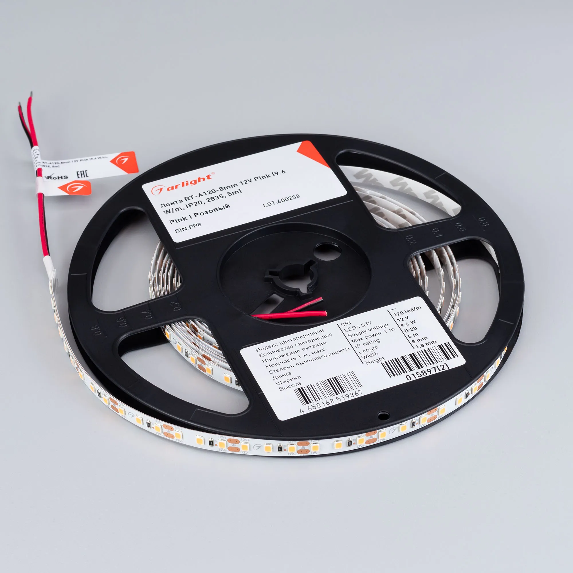 Светодиодная лента RT серии A120. Светодиоды SMD 2835, 120 шт/м, белая плата шириной 8 мм, скотч 3M. Цвет РОЗОВЫЙ, угол 120°. Питание 12 В, мощность 9.6 Вт/м (48 Вт на 5 м). Размеры 5000x8x1.5 мм. Мин. отрезок 25 мм, 3 светодиода. Цена за 1 м.