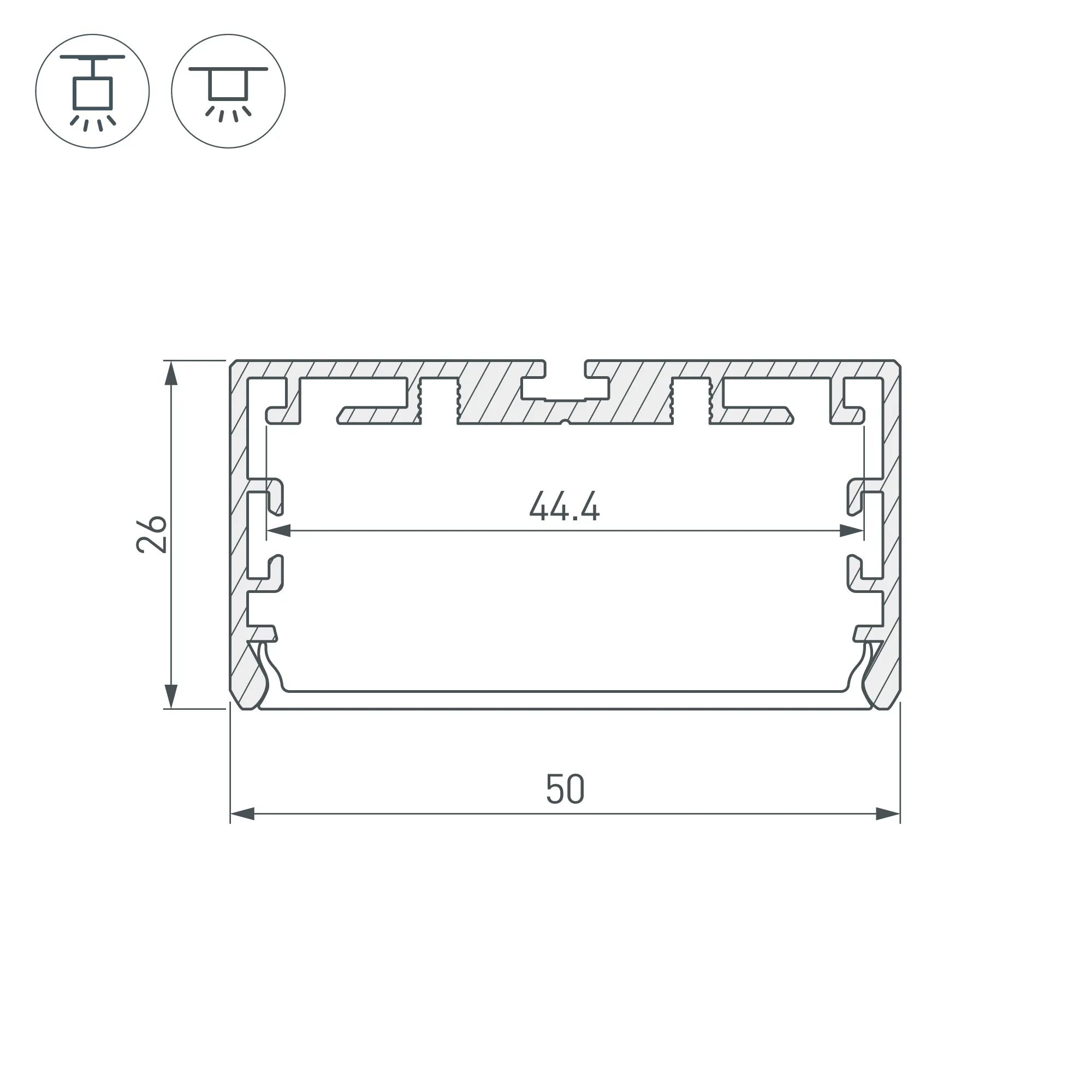 Алюминиевый анодированный профиль для светодиодных лент и линеек. Габаритные размеры (L×W×H): 2000x50x26 мм. Ширина площадки для ленты 44 мм. Экраны, заглушки и другие аксессуары приобретаются отдельно. Цена за 1 метр.