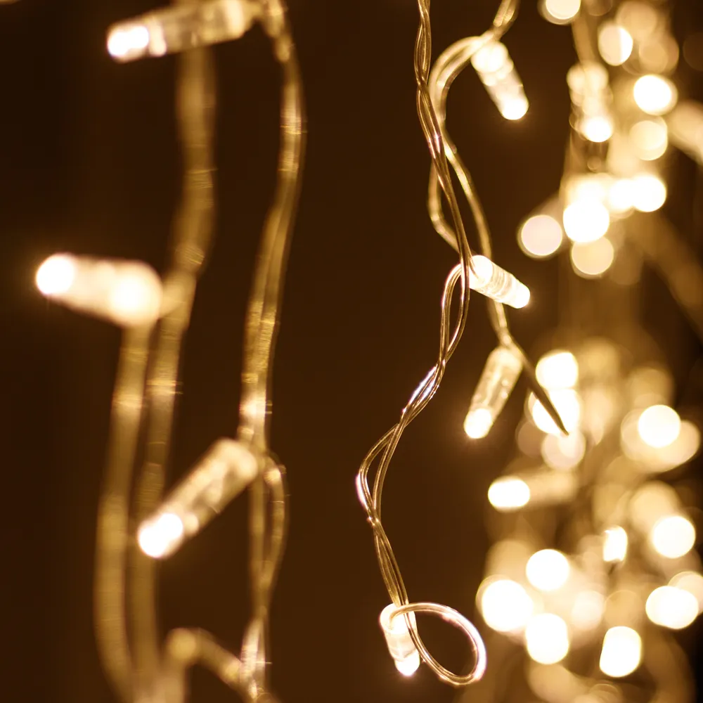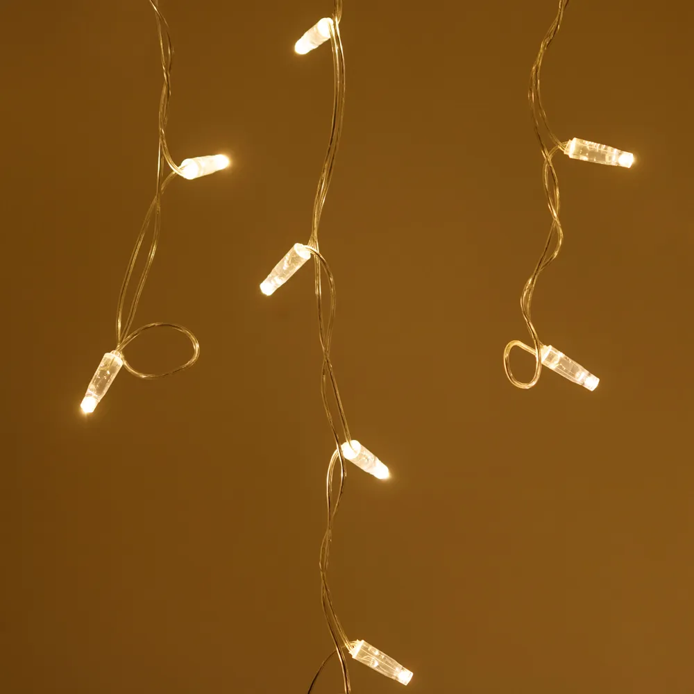 Светодиодная бахрома Classic. Размер 2400x600 мм (длина 2400 мм, по длине 24 нити высотой 200/600 мм). Количество светодиодов 88 шт размером 7 мм. Цвет свечения ТЕПЛЫЙ БЕЛЫЙ (3000 К), эффект постоянного свечения с мягким световым рисунком (выпуклая молочно-белая линза). Провод прозрачный, ПВХ. Питание 230 В, Мощность 6 Вт, защита IP65, применение на улице под навесом. Аксессуары для подключения приобретаются отдельно.