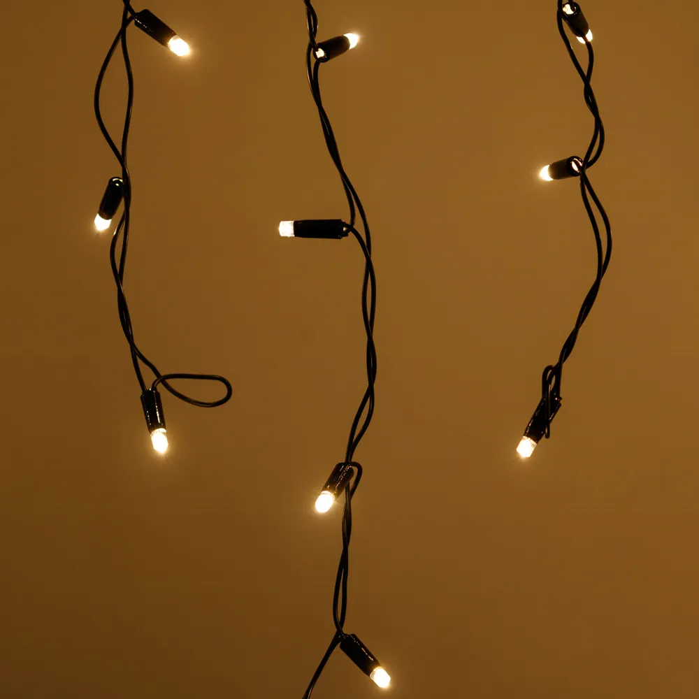 Светодиодная бахрома Pro. Размер 4000x600 мм (длина 4000 мм, по длине 32 нити высотой 200/600 мм). Количество светодиодов 128 шт размером 7 мм. Цвет свечения ТЕПЛЫЙ БЕЛЫЙ (3000 К), эффект постоянного свечения с мягким световым рисунком (выпуклая молочно-белая линза). Провод черный, резиновый. Питание 230 В, Мощность 8 Вт, защита IP65, применение на улице под навесом. Аксессуары для подключения приобретаются отдельно.
