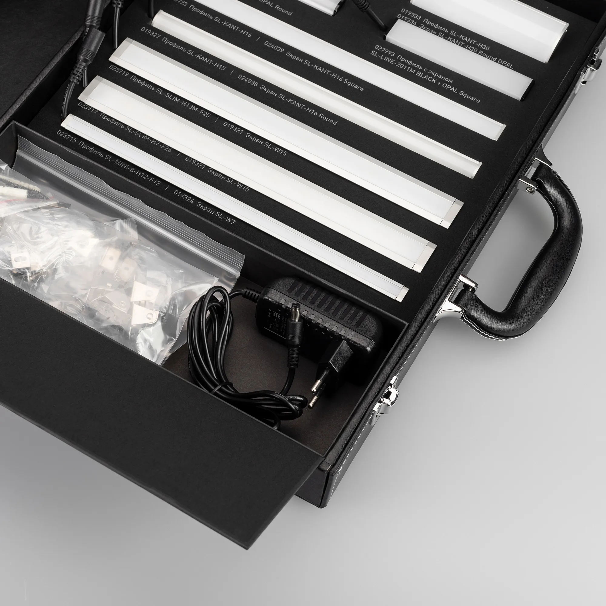 Демонстрационный набор обновлённых профилей серий SL-LINE-2011, SL-KANT-H16/H30, SL-SLIM/SLIM20, SL-MINI-8. Включает отрезки профиля с экраном и заглушками по 20см со светодиодной лентой 24В. Также в комплекте блок питания.