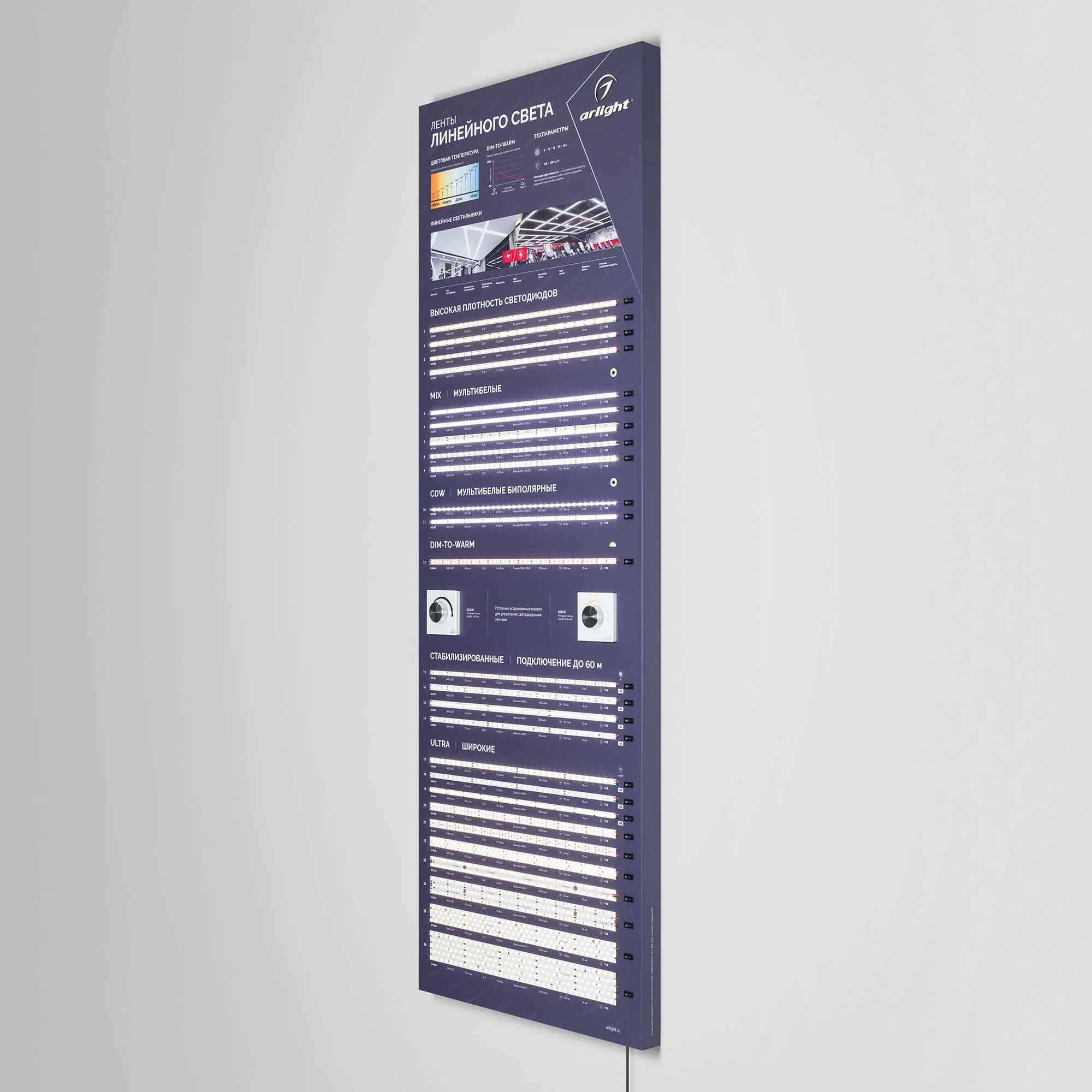 Наши специалисты знают все о продукции Arlight и с радостью помогут Вам выбрать комплектующие к товару "Стенд Ленты Линейного Света RT-LUX-E2-1760x600mm (v.2, DB 3мм, пленка, подсветка) (Arlight, -)", или другие товары из раздела "Светодиодные ленты".