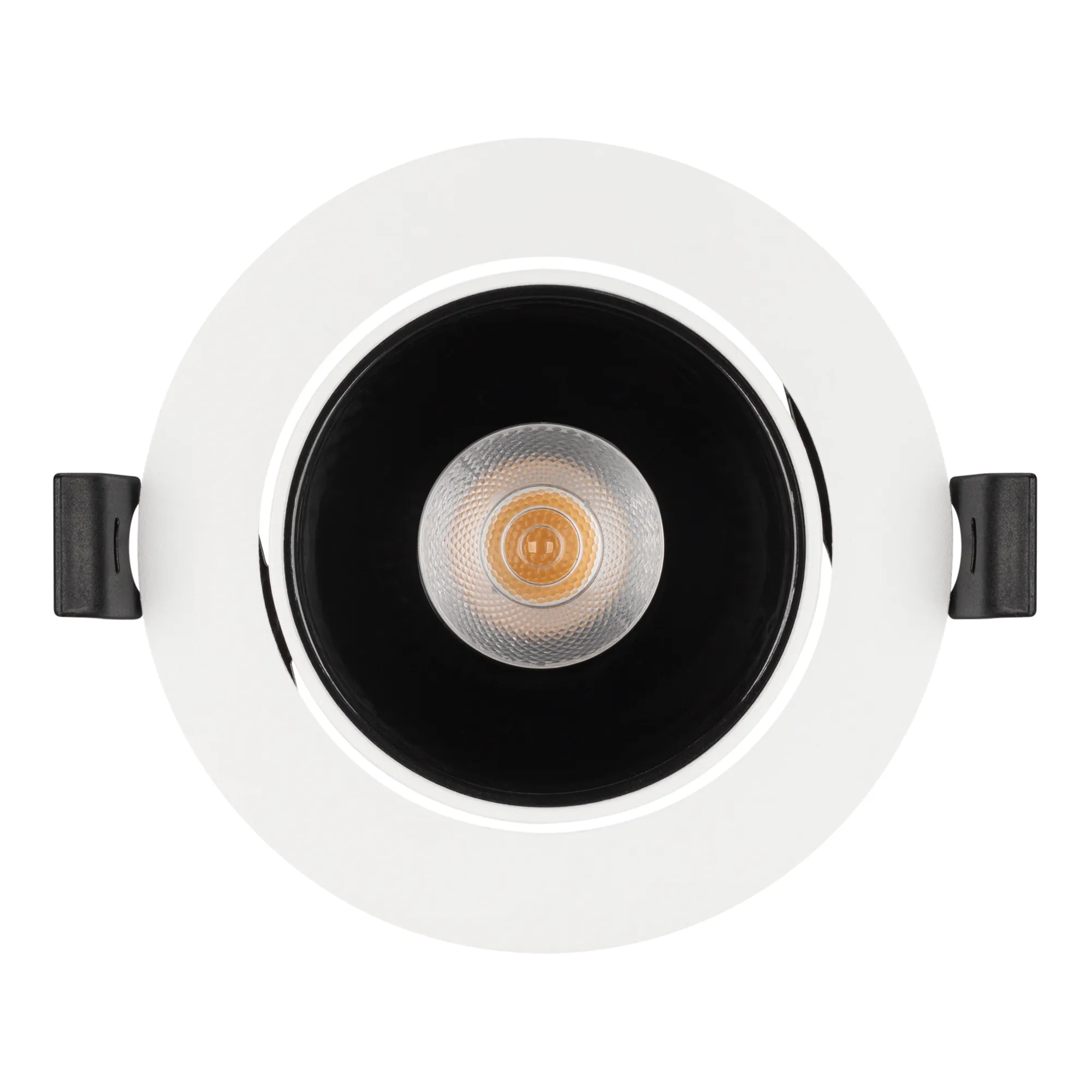 Встраиваемый поворотный светильник даунлайт. Мощность 12 Вт, св. поток 890 лм, 75 лм/Вт, теплый 3000 K, CRI>90, UGR<16, угол 32°, напряжение питания 230 В. Белый круглый корпус из алюминия, черный ГЛЯНЦЕВЫЙ отражатель из PMMA, степень защиты IP20. Размер: диаметр 102 мм, высота 70 мм. Монтаж встраиваемый, установочное отверстие: диаметр 95 мм. Драйвер 20-40 В, 300 мА, пульсация <2%.