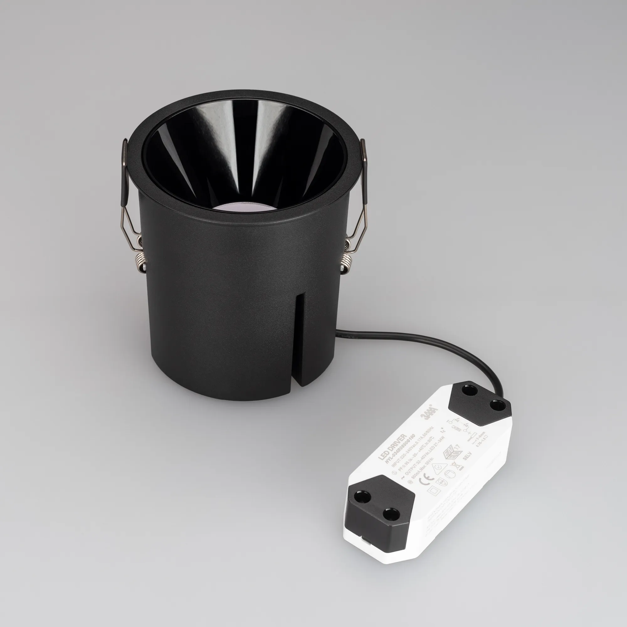 Поставка под заказ от 100 шт. Встраиваемый светильник даунлайт. Мощность 32.8 Вт, св. поток 3280 лм, 100 лм/Вт, дневной 5000 K, CRI>90, UGR<16, угол 30°, напряжение питания 230 В. Черный круглый корпус из алюминия, степень защиты IP20. Размер: диаметр 112 мм, высота 114 мм. Монтаж встраиваемый, установочное отверстие: диаметр 105 мм. Драйвер 32-40 В, 850 мА, пульсация <2%.