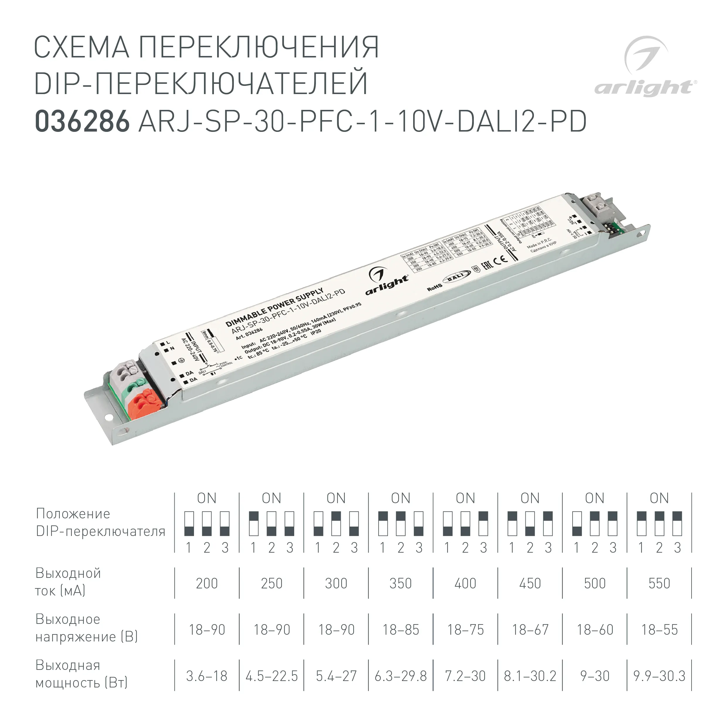 Диммируемый источник тока по протоколу DALI 2.0 (диапазон 0-100%) и 1-10V (диапазон 2%-100%) с гальванической развязкой для светильников и мощных светодиодов. Входное напряжение 220-240 VAC. Выходные параметры: 18-90В (200мA), 18-90В (250мА), 18-90В (300мА), 18-85В (350мА), 18-75В (400мА), 18-67В (450мА), 18-60В (500мА), 18-55В (550мА), максимальная мощность 30 Вт. Встроенный PFC >0.95. Негерметичный металлический корпус IP 20. Габаритные размеры длина 284 мм, ширина 30 мм, высота 21 мм. Гарантийный срок 5 лет.