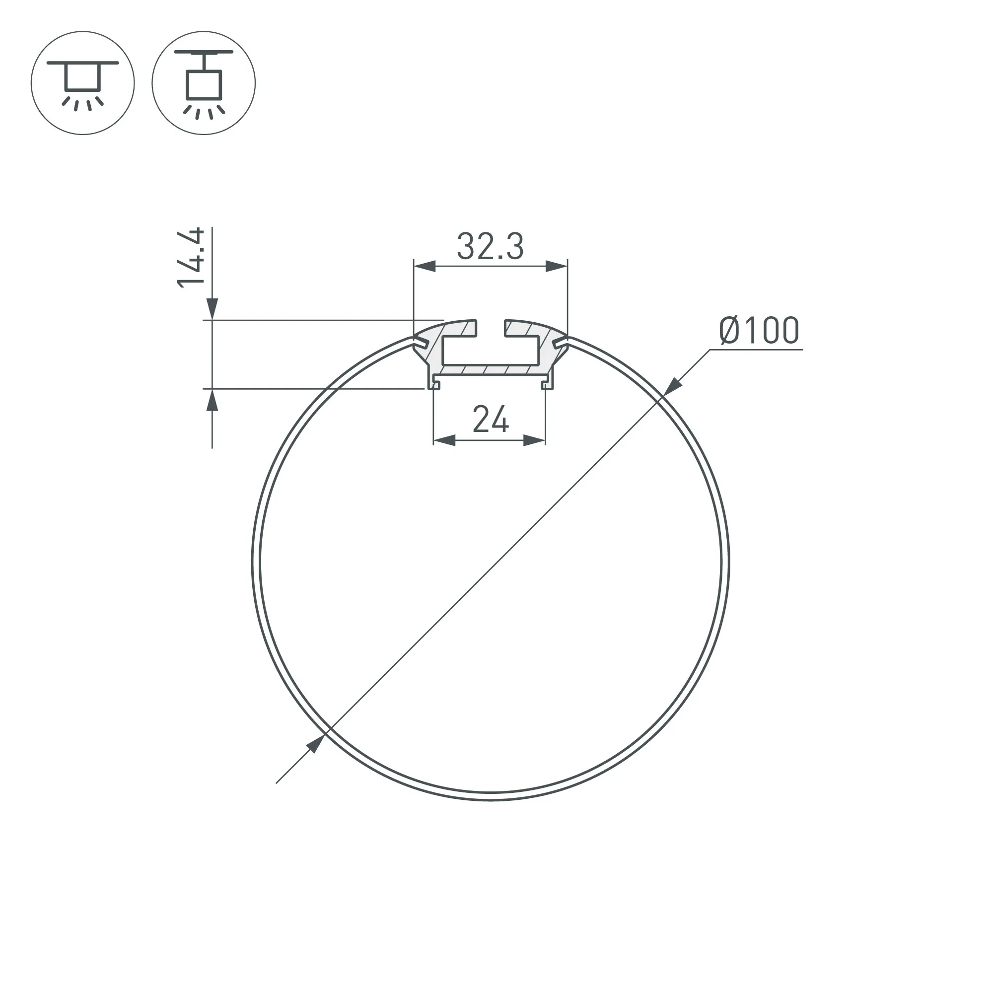 Под заказ от 10 м. Алюминиевый анодированный круглый профиль для светодиодных лент и линеек. Габаритные размеры профиля (L×W×H): 2000x32.3x14.4 мм. Габаритные размеры профиля с экраном (L×D): 2000xD100 мм. Ширина площадки для ленты 24 мм. Экраны, заглушки и другие аксессуары приобретаются отдельно. Цена за 1 метр.