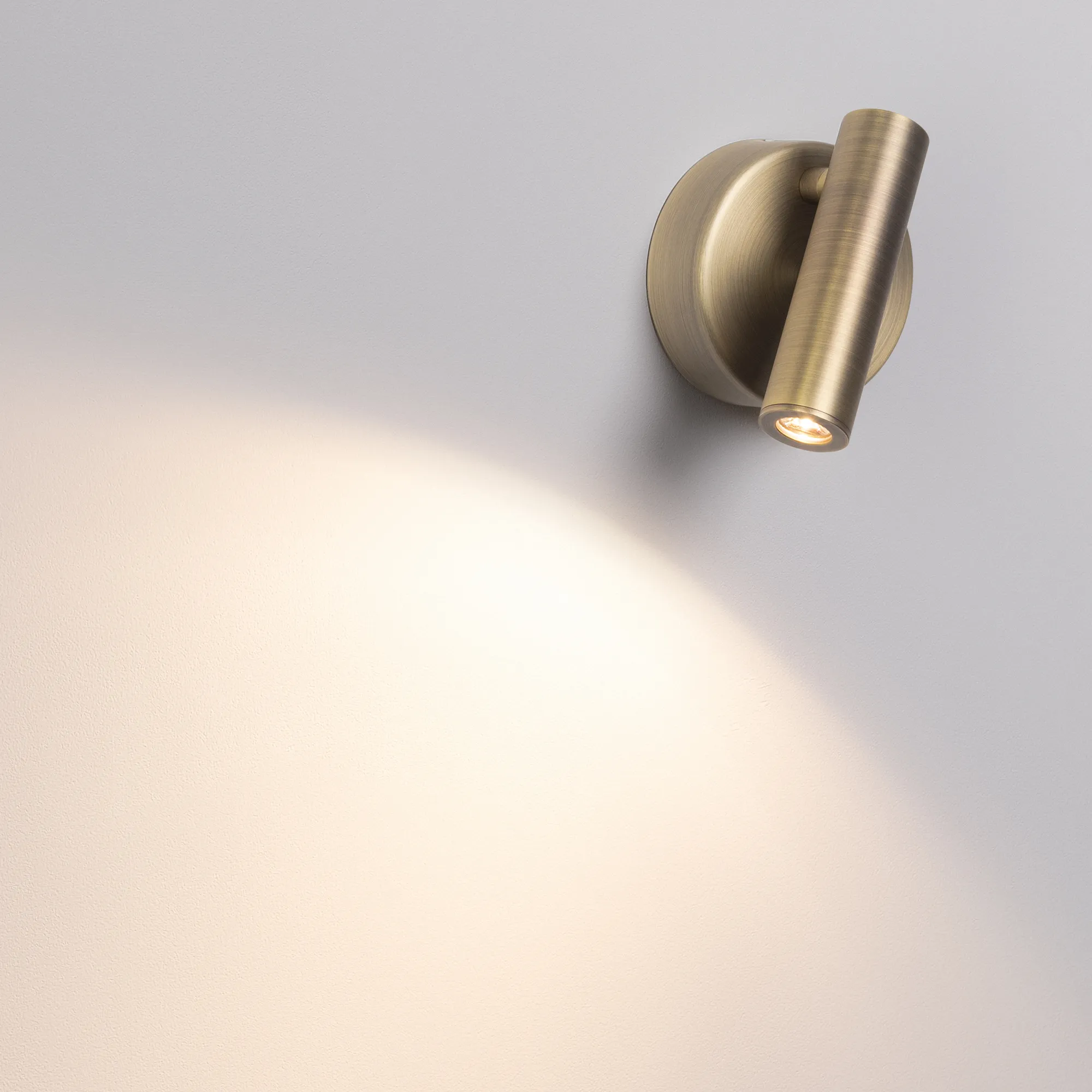Накладной настенный светильник 3Вт, алюминиевый корпус в бронзовом цвете без кнопки включения. Цвет ТЕПЛЫЙ БЕЛЫЙ 3000K, св.поток 200лм, CRI(Ra)>80, угол 20°. Размер Основание Ф90x31мм, Светоизлучатель Ø30×110 мм. IP20. Питание AC220-240V, 3Вт, встроенный драйвер 2,5-4,5В, 700 мА.