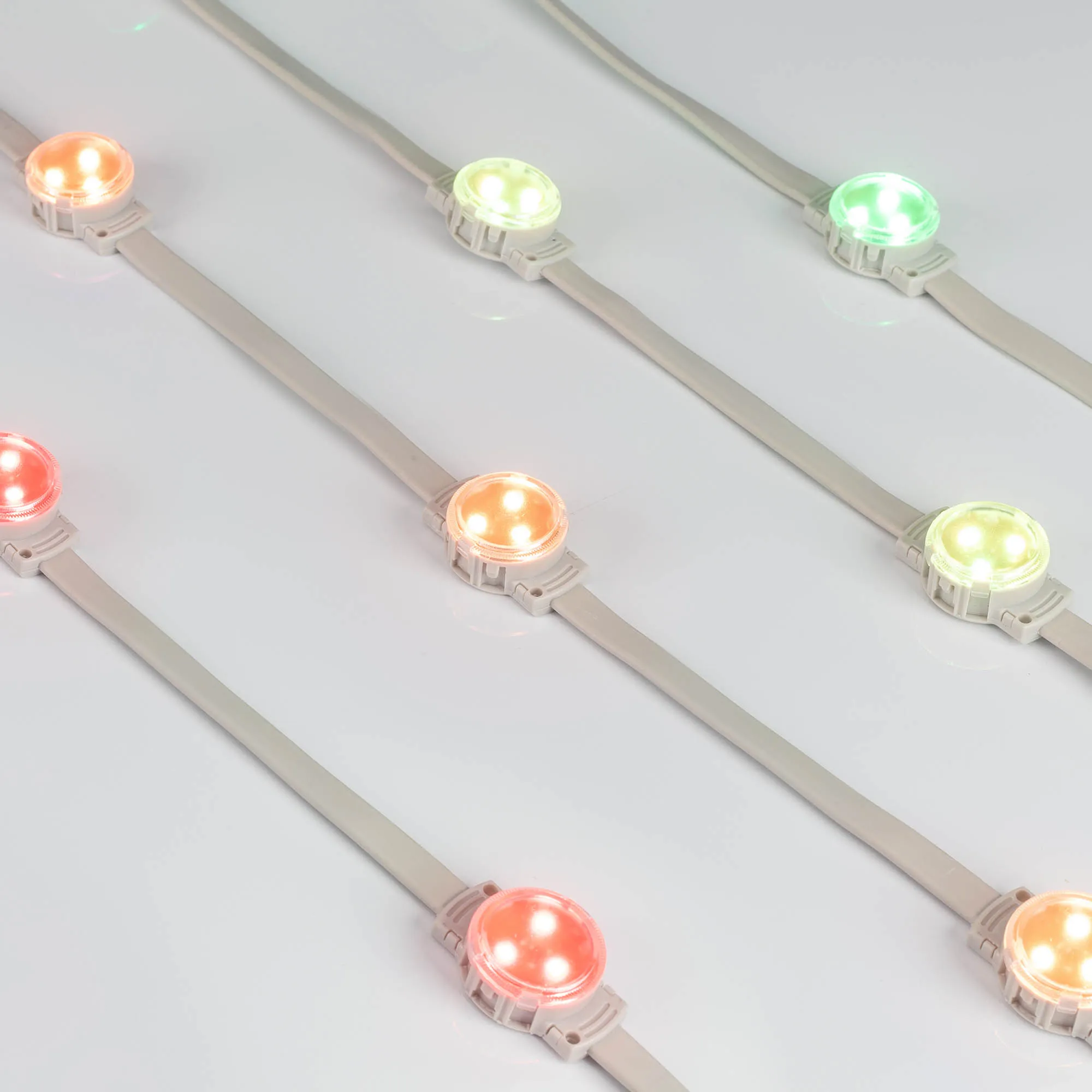 Управляемый светодиодный модуль SPI, RGB, микросхема MT26803 (UCS1903 на контроллере), напряжение 12 В, мощность 0.6 Вт, 3 светодиодов SMD 3535, угол 120°. Создание медиафасадов, 30 шт на проводе, расстояние между центрами модулей 170 мм, длина провода между модулями 130 мм. Степень пылевлагозащиты IP68. Размер Ø30x16 мм. Гарантия 3 года.