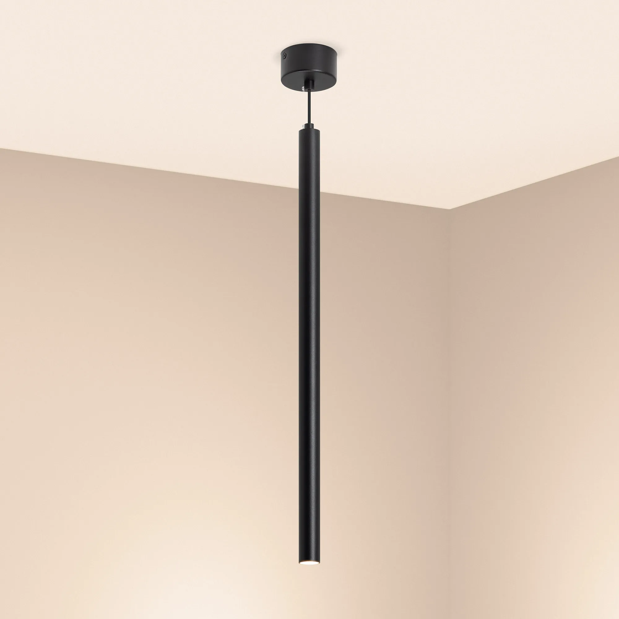 Подвесной светильник. Мощность 9 Вт, св. поток 561 лм, 64 лм/Вт, теплый 3000 K, CRI>90, угол 24°, напряжение питания 230 В. Черный круглый корпус из алюминия, рассеиватель PC, степень защиты IP20. Размер: диаметр 30 мм, длина 600 мм, размер чаши: диаметр 80 мм, высота 40 мм. Монтаж подвесной, длина подвеса 1500 мм. Драйвер 28-42 В, 200 мА, пульсация <1%.