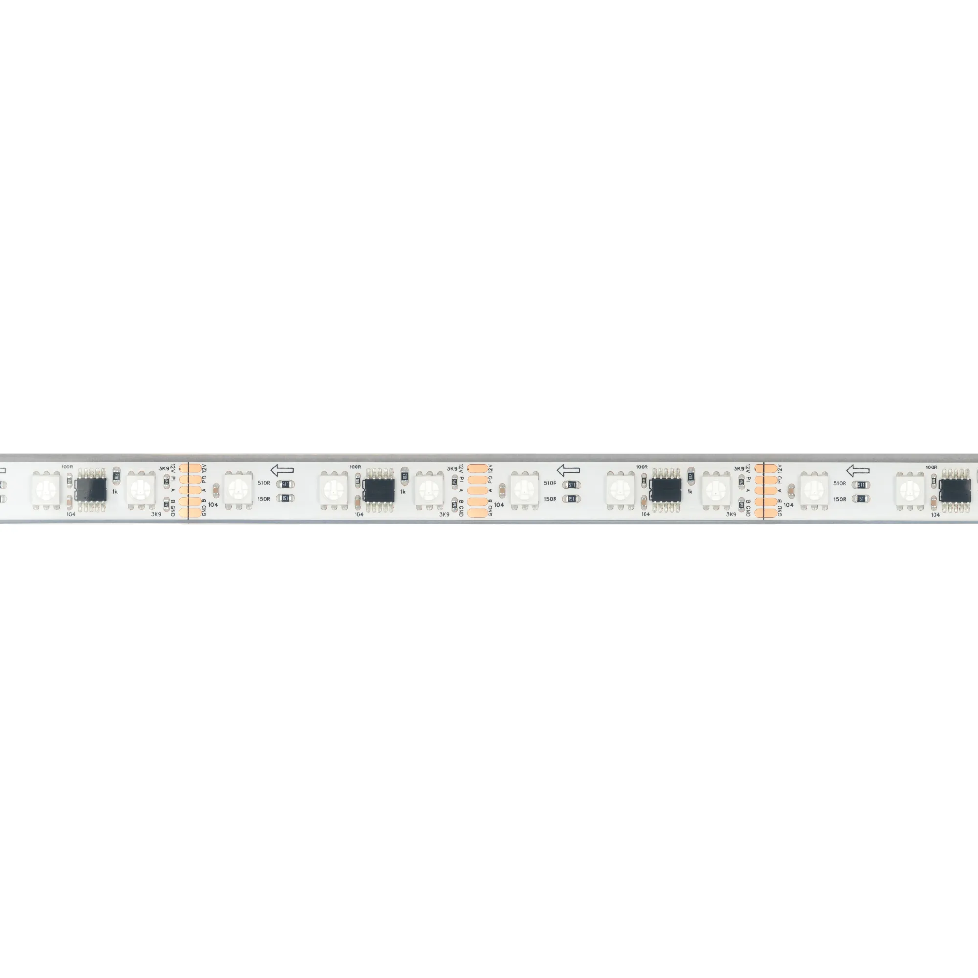 Светодиодная герметичная лента DMX серии B60 с микросхемой GS8516 (GS8526), IP68 (PFS - полная силиконовая экструзия). Светодиоды SMD 5060, 60 шт/м, 20 pixels на 1 м (100 pixels на 5 м), 1 pixel = 3 светодиода, белая плата шириной 10 мм, скотч 3М. Цвет RGB, угол 120°. Питание 12 В, мощность 14 Вт/м (70 Вт на 5 м). Размеры 5000x12x5 мм. Мин. отрезок 50 мм, 3 светодиода. Цена за 1 м.