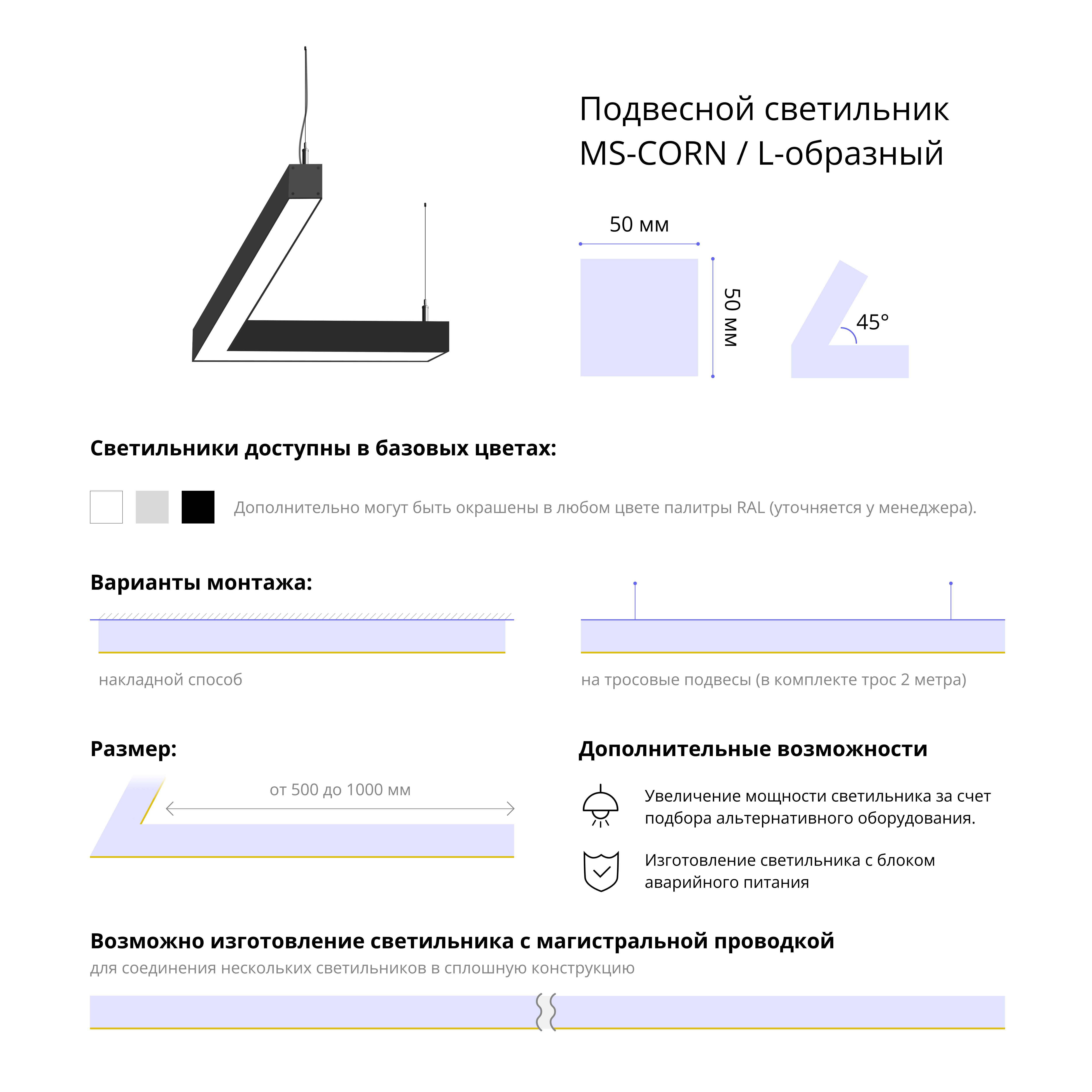 Светодиодный фигурный светильник MS-CORN L-образный 45гр. размер профиля 50х50мм длиной 1000х1000мм мощностью 40W. Светильник собирается в алюминиевом корпусе с матовым рассеивателем, который дает равномерную засветку по всей площади.