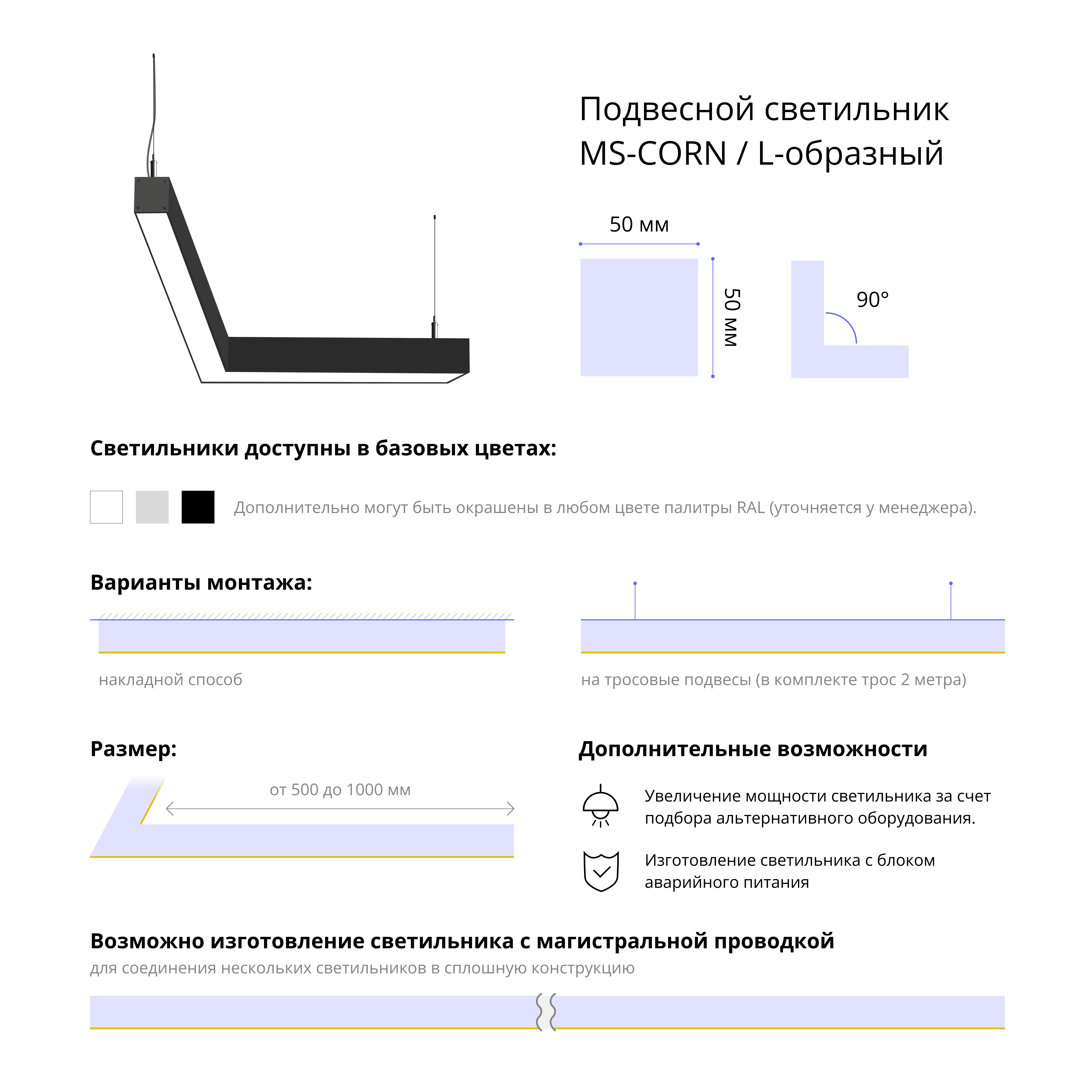 Светодиодный фигурный светильник MS-CORN L-образный 90гр. размер профиля 50х50mm длиной 500х500mm мощностью 40W. Светильник собирается в алюминиевом корпусе с матовым рассеивателем, который дает равномерную засветку по всей площади.