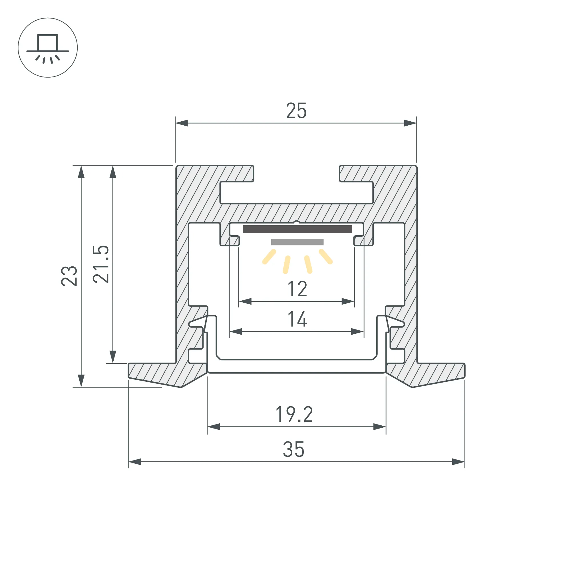 Алюминиевый профиль для светодиодных лент и линеек. Цвет - белый RAL9003 (порошковая окраска). Габаритные размеры (L×W×H): 2500x35,6x23,2 мм, паз для установки 25 мм. Ширина площадки для ленты 12 мм. Экраны, заглушки и другие аксессуары приобретаются отдельно. Цена за 1 метр.
