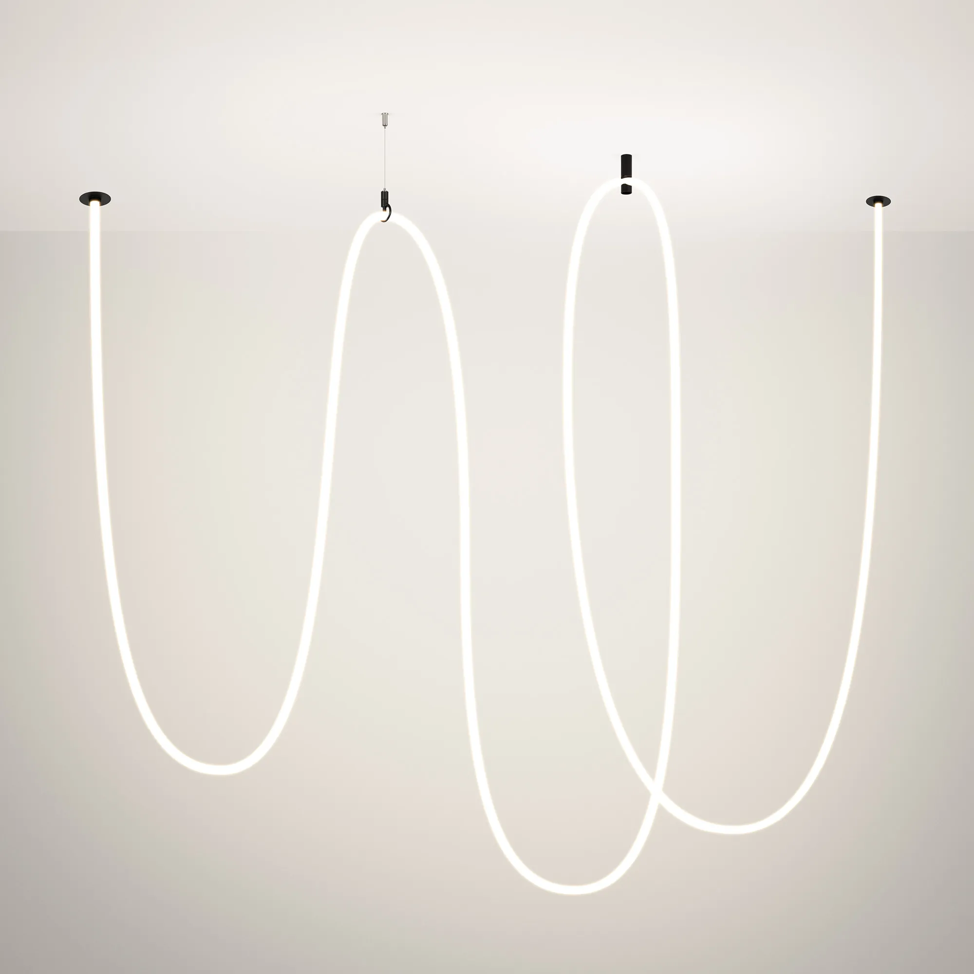 Подвесной светильник. Мощность 110 Вт, св. поток 7455 лм, 67 лм/Вт, дневной 4000 K, CRI>90, угол 360°, напряжение питания 230 В. Черный круглый корпус из стали, силиконовая герметичная лента, степень защиты IP20. Размер: диаметр утапливаемой части чаши 64 мм, высота чаши с утапливаемой частью без вывода под неон 40 мм, общая высота чаши 57 мм, диаметр чаши с фланцем 100 мм, диаметр силиконовой герметичной ленты 18 мм, длина силиконовой герметичной ленты 10000 мм. Монтаж встраиваемый, глубина установки 55 мм, диаметр установочного отверстия 70 мм. Блок питания 24 В, 2500 мА, пульсация <5% (2 шт.) в комплекте