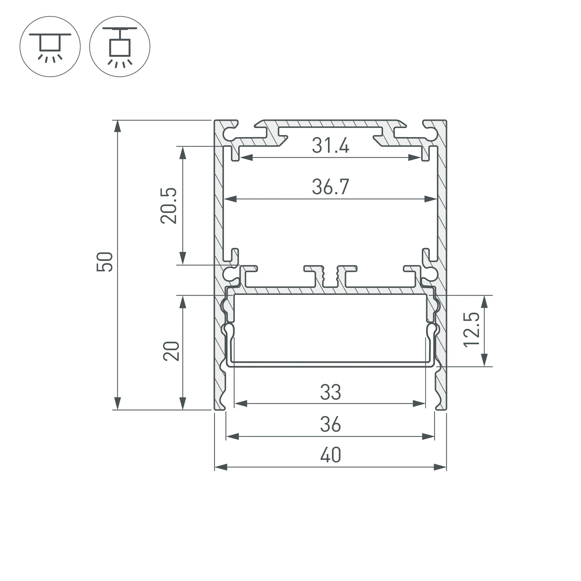 Алюминиевый анодированный профиль со съемной площадкой для светодиодной ленты в комплекте. Габаритные размеры (L×W×H): 2000x40x50,6 мм. Ширина площадки для ленты 33мм. Отсек для БП 31,4х20,5 мм. Возможность установки экрана на разных уровнях (три варианта). Экраны, заглушки и другие аксессуары приобретаются отдельно. Цена за 1 метр.