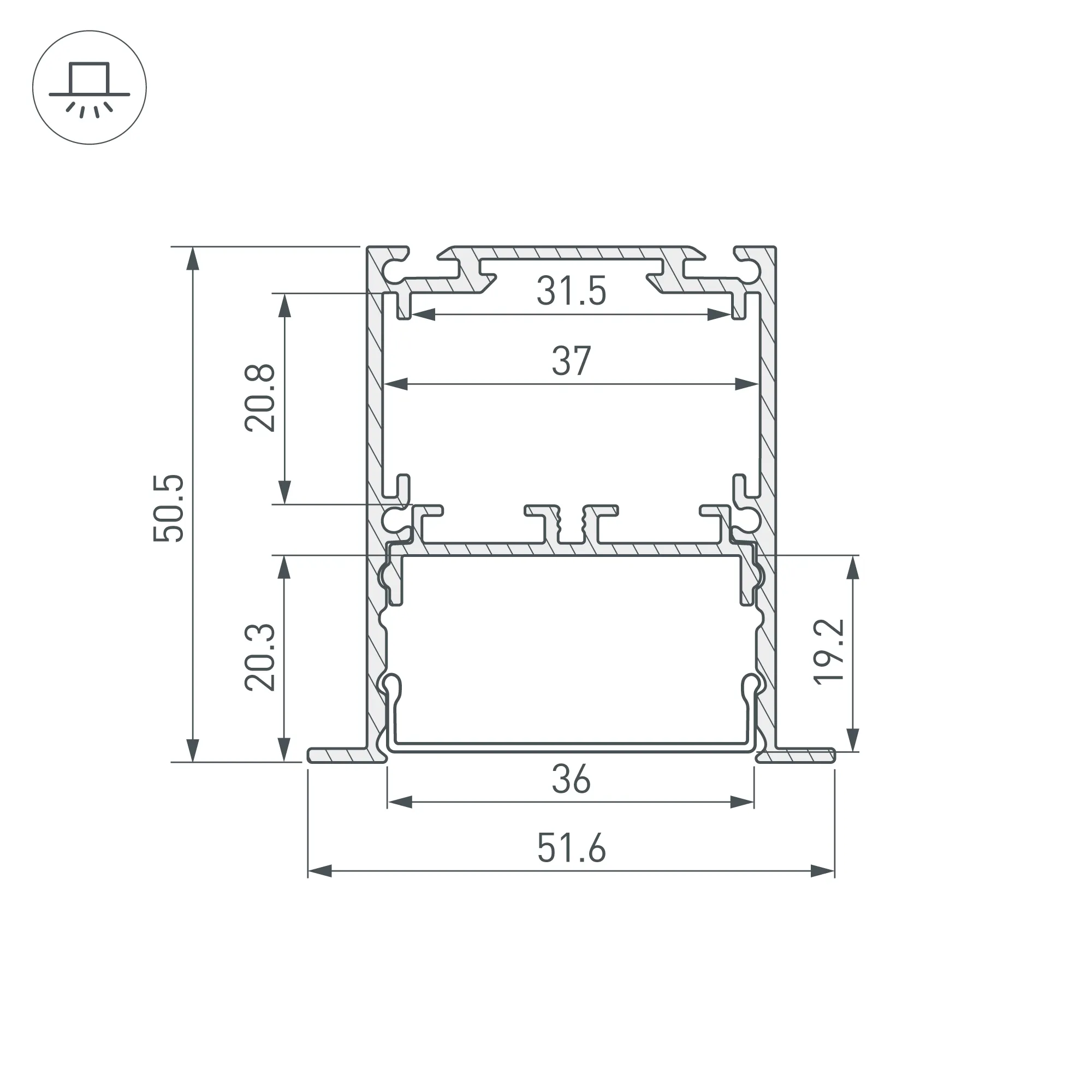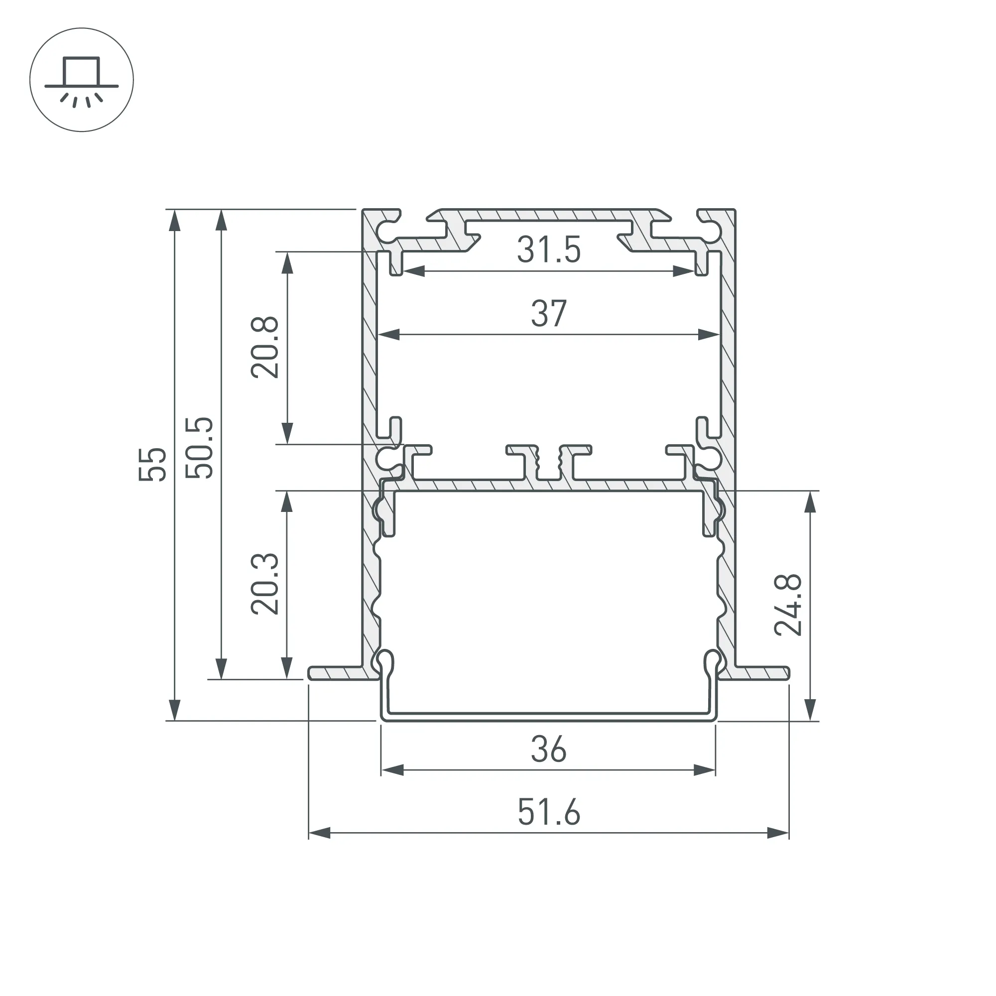 Встраиваемый алюминиевый анодированный профиль со съемной площадкой для светодиодной ленты в комплекте. Цвет - черный. Габаритные размеры (L×W×H): 2000x51,6x50,5 мм. Ширина площадки для ленты 33мм. Отсек для БП 31,5х20,8 мм. Возможность установки экрана на разных уровнях (три варианта). Экраны, заглушки и другие аксессуары приобретаются отдельно. Цена за 1 метр.