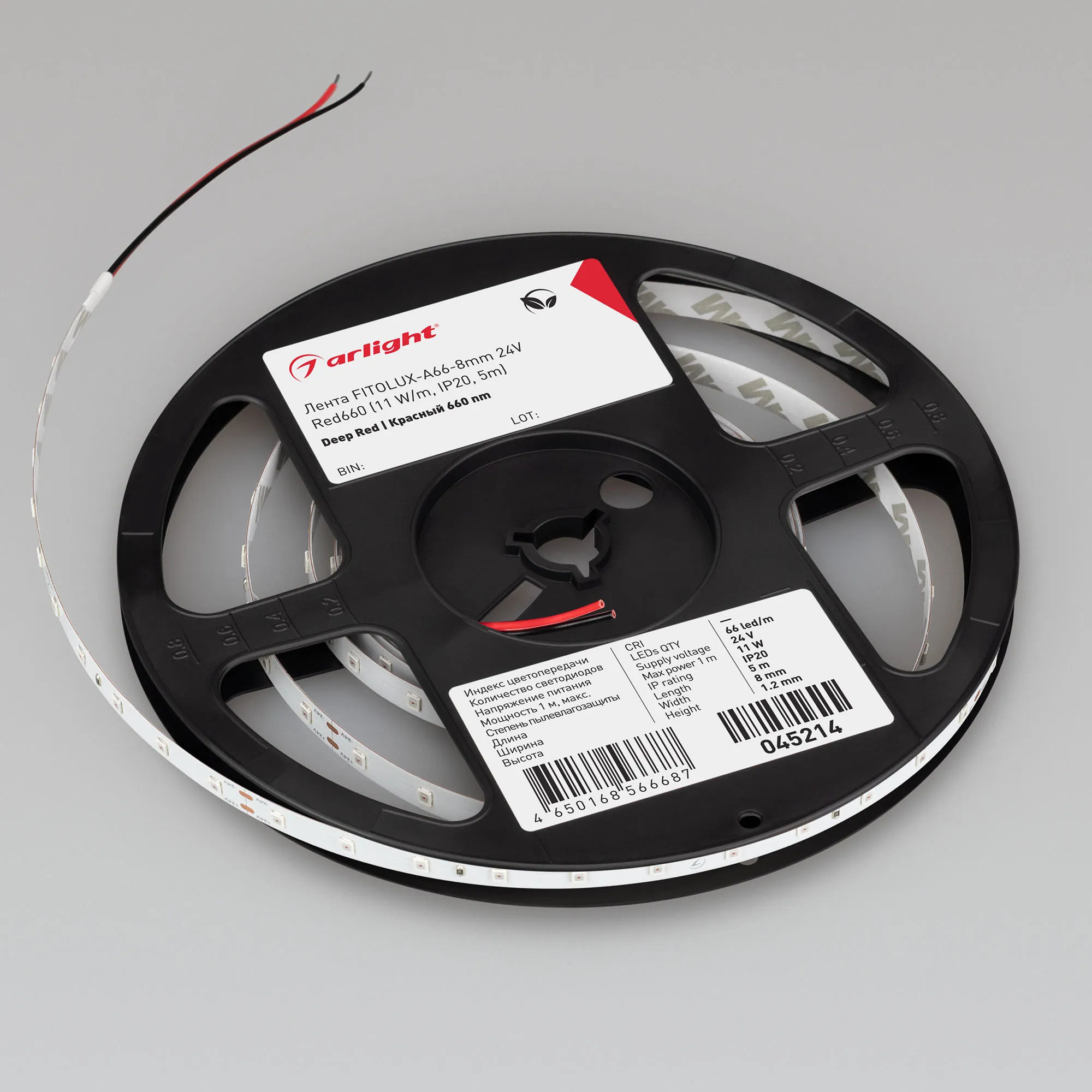 Светодиодная лента FITOLUX серии A66 для досветки растений. Светодиоды SMD 2835, 66 шт/м, белая плата шириной 8 мм, скотч 3M. Цвет КРАСНЫЙ 660 нм. Питание 24 В, мощность 11 Вт/м (55 Вт на 5 м), угол 120°. Размеры 5000х8x1.2 мм. Мин. отрезок 167 мм, 11 светодиодов. Цена за 1 м. Обязательна установка на профиль.