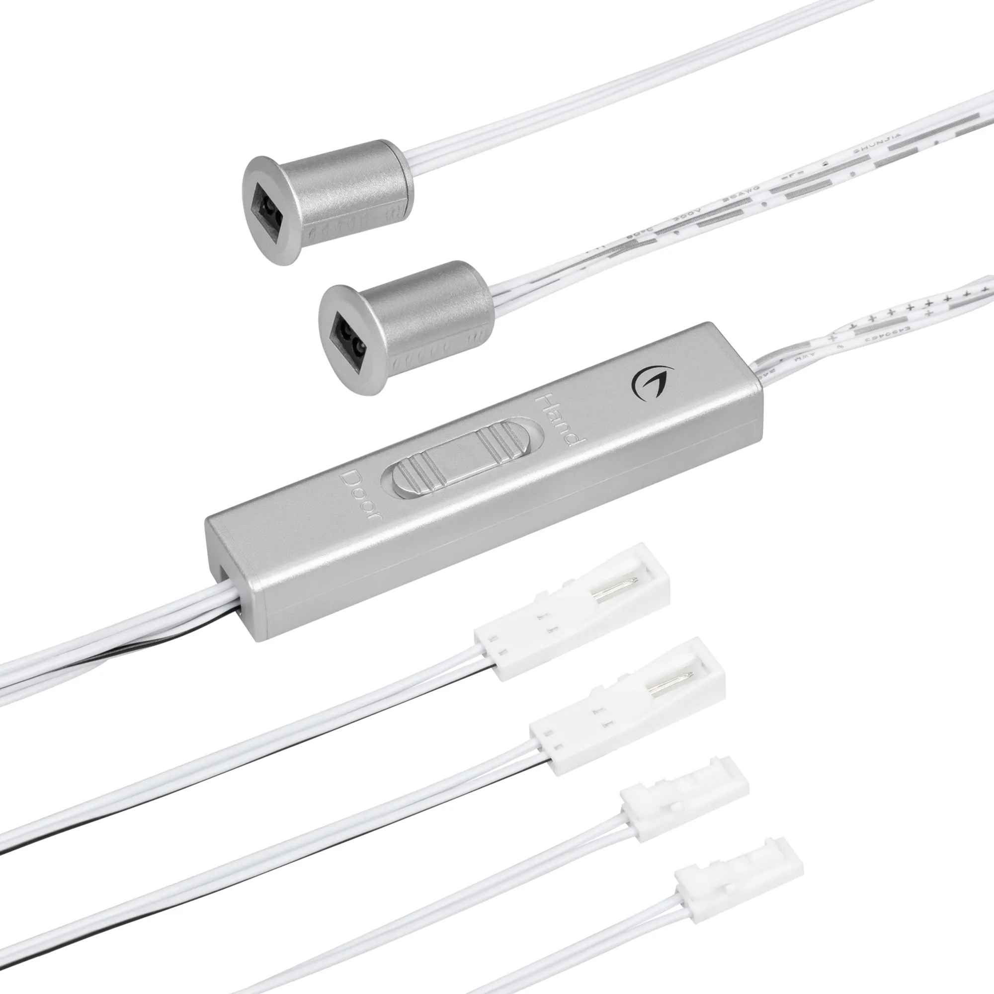 Выключатель для светодиодной ленты 12-24 В. В комплекте 2 датчика. Питание/рабочее напряжение DC 12-24 В, максимальный ток 4 A на канал, 1 канал, максимальная мощность 48-96 Вт. Реагирует на открывание дверей или движение рукой, переключатель между режимами «hand» - «door» расположен на корпусе блока управления. Расстояние срабатывания до 10 см, датчик открыт — «вкл», закрыт — «выкл». Габаритные размеры блока управления: 75 х 15 х 11 мм, кабель 1 м (у датчика), кабель 25 см (питание). Габаритные размеры датчика: 11 х 18 мм, врезное отверстие Ø 11 мм.