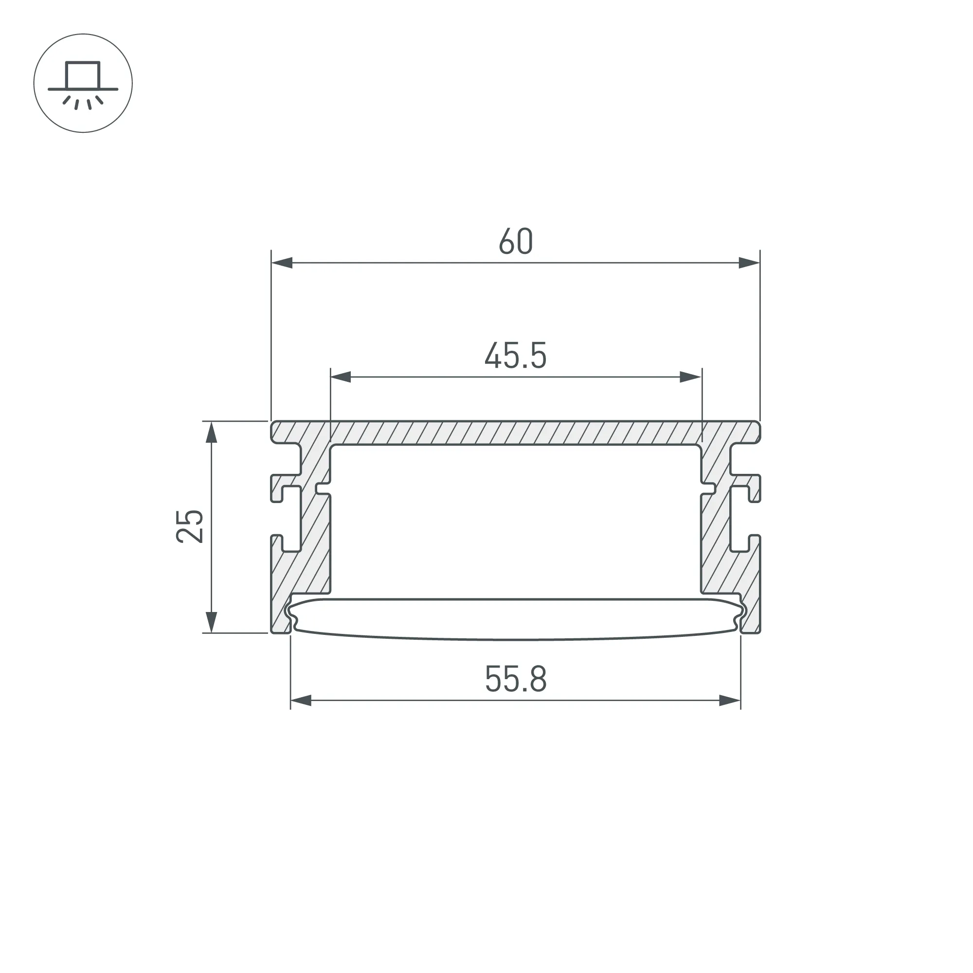 Алюминиевый анодированный встраиваемый профиль для пола. Возможность герметизации до IP65 (при использовании силиконового клея для фиксации экрана и заглушек), IK10 (08-10). Цвет - черный. Габаритные размеры (L×W×H): 3000x60x25,8 мм. Ширина площадки для ленты 45,5 мм. Заглушки и экран приобретаются отдельно. Цена за 1 метр.
