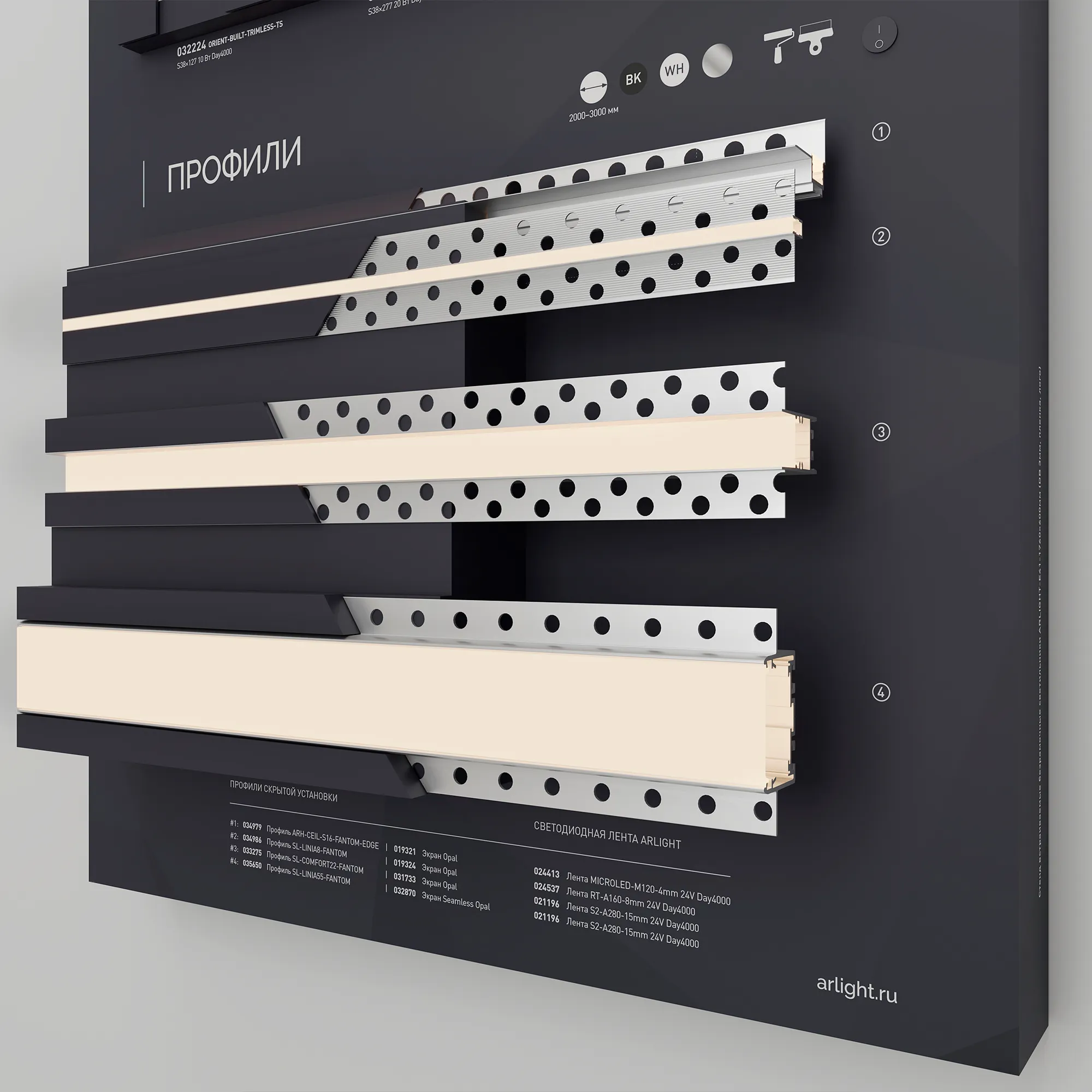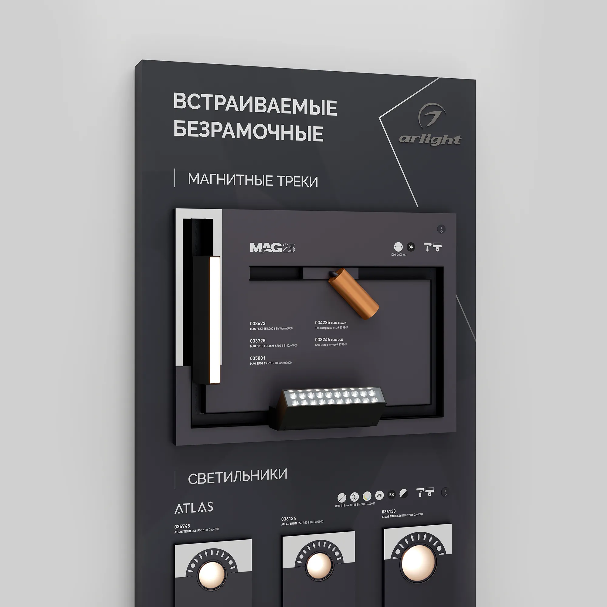 Стенд Безрамочное освещение. Включает в себя магнитные треки, светильники ATLAS, ORIENT, профили для установки под шпаклевку.